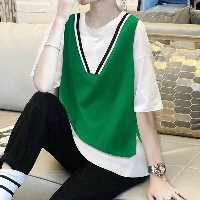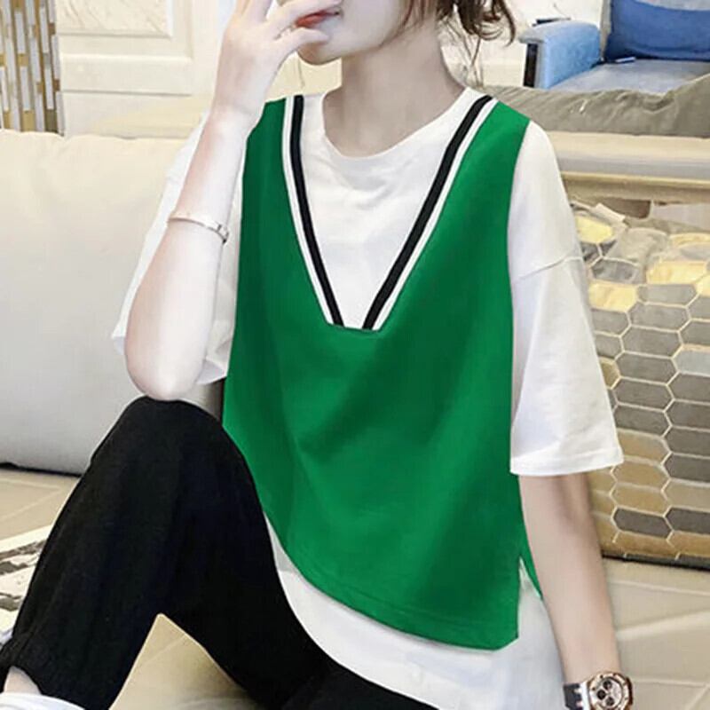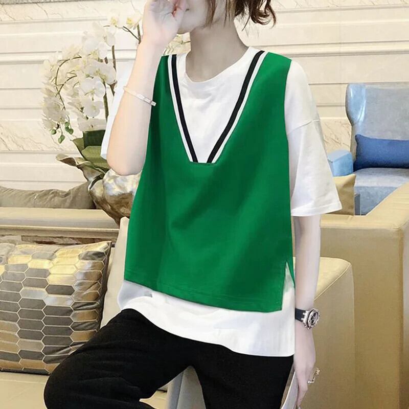 送料無料 ルーズスプライスフェイクツーピースブラウス女性の2023夏プルオーバー半袖通勤シャツ ショート ハーフスリーブ サマー 夏物 AE1288776645910654842