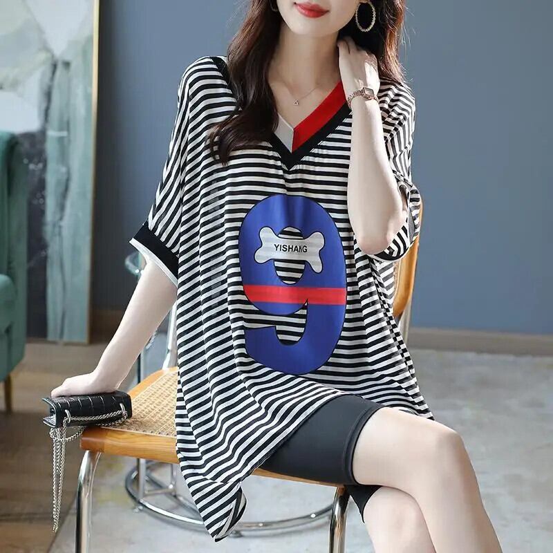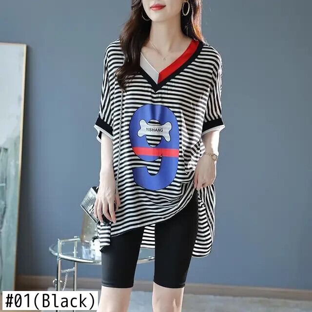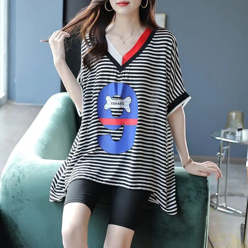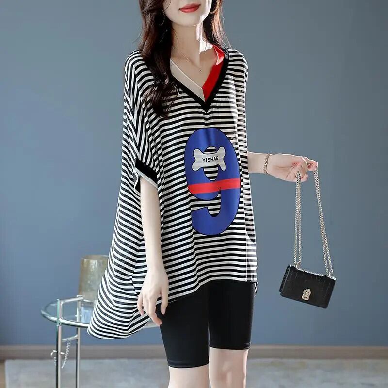 送料無料 プリントデジタル不規則ストライプブラウス 2023 夏特大トップスルーズ非対称シャツ サマー 夏物 AE1288776639905868784