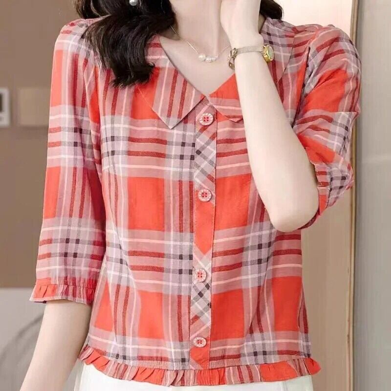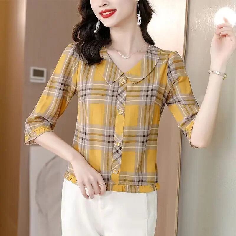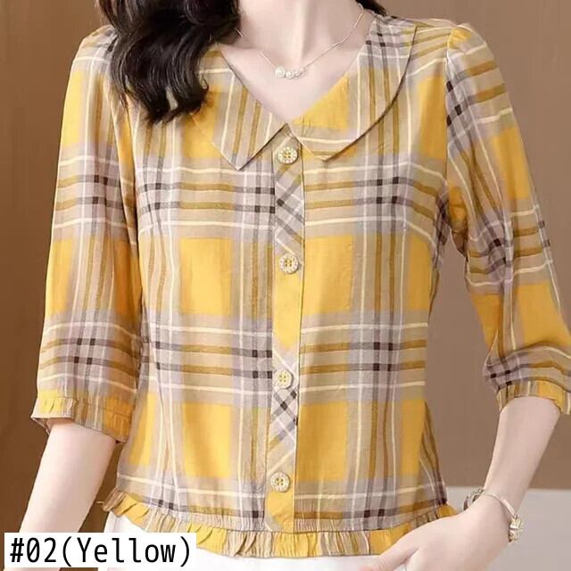 送料無料 プリントピーターパン襟フリルストライプブラウス女性夏特大プルオーバーオフィスレディシャツ ラッフル サマー 夏物 会社 学校 通勤や通学にも AE1288776671459628933