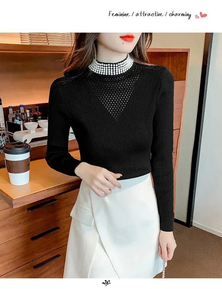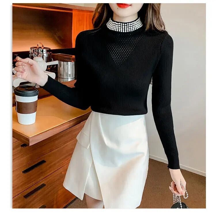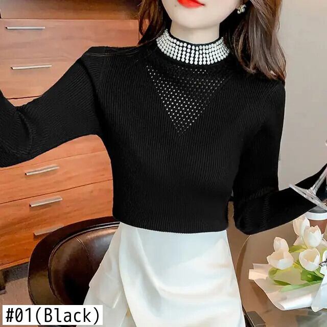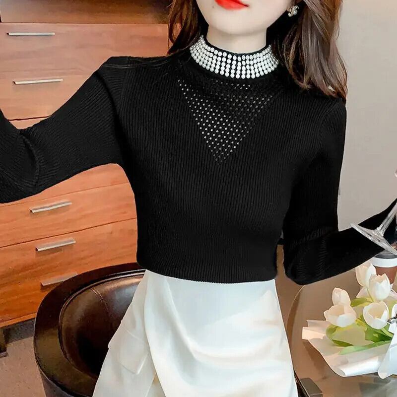 送料無料 スタンドカラースプライシング中空ダイヤモンドセーター女性 2023 秋冬ルーズプルオーバートップス オータム 秋物 ウィンター 冬物 AE1288776641358428902