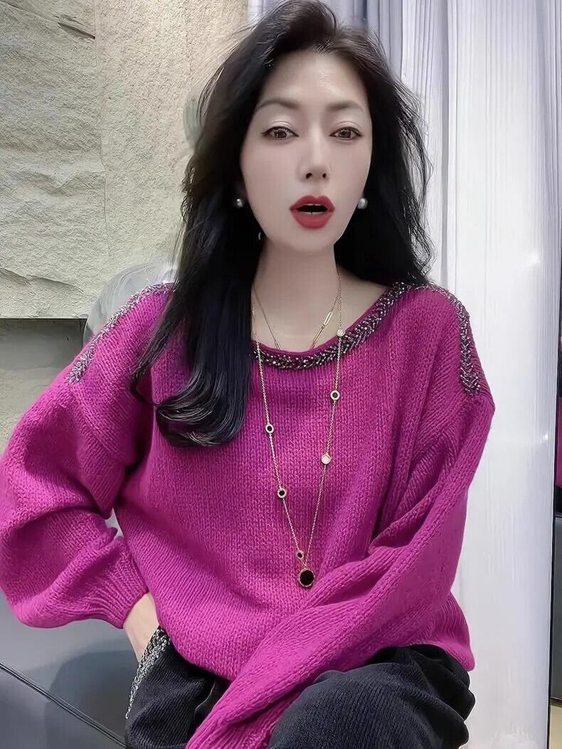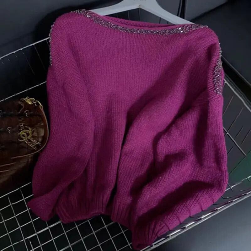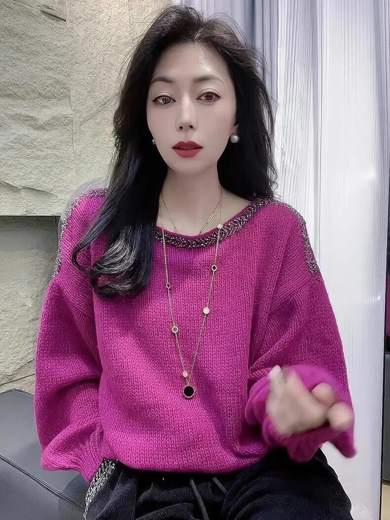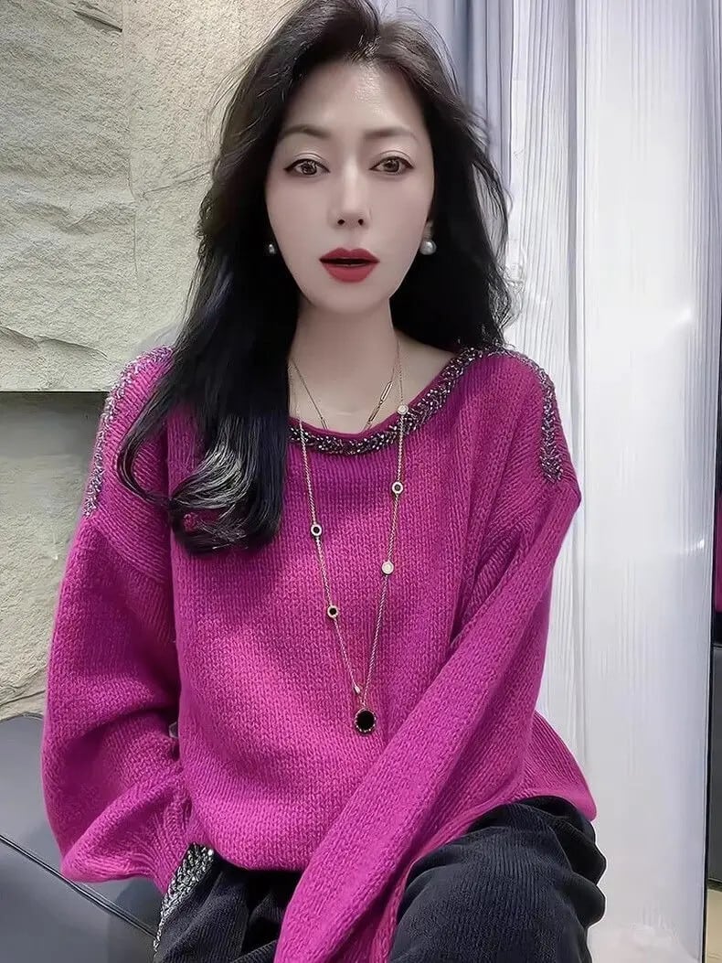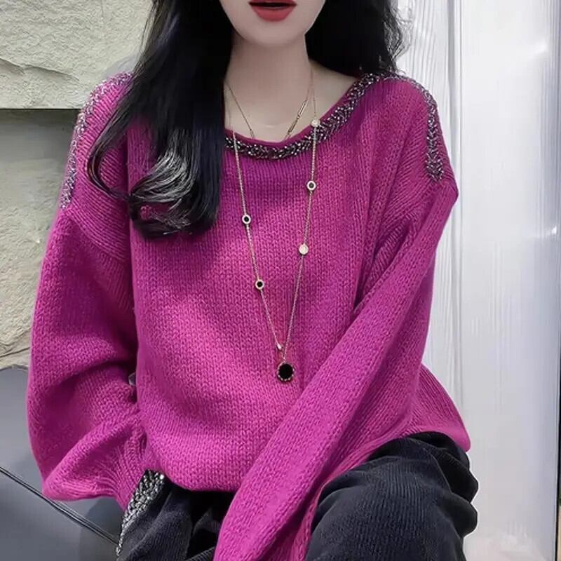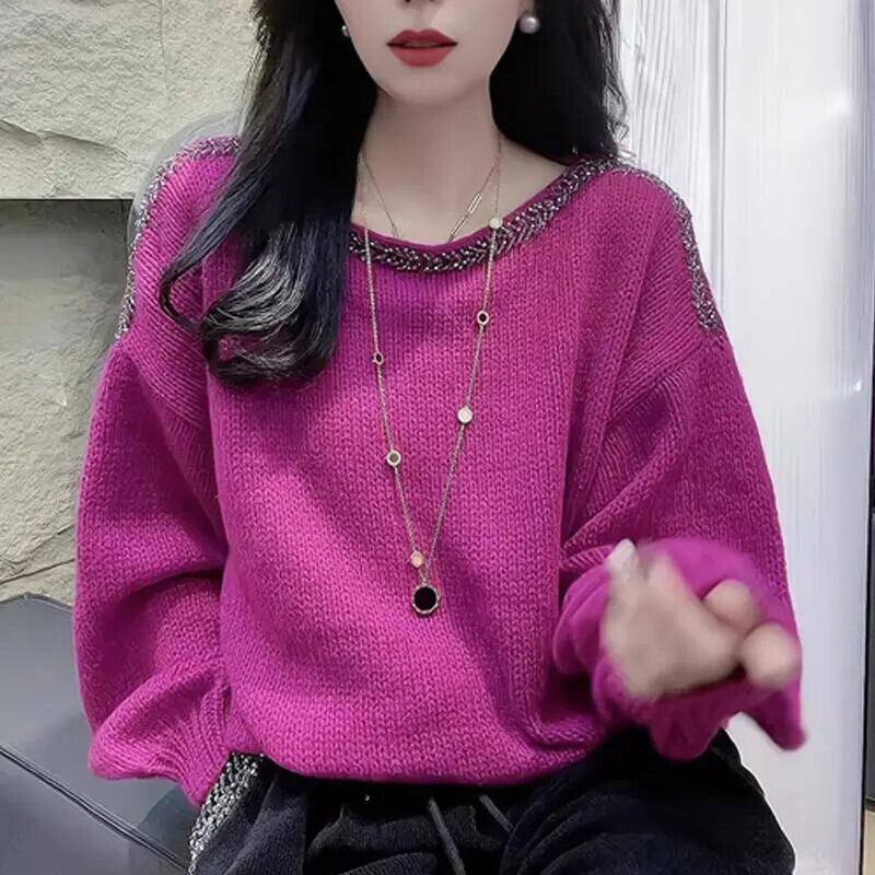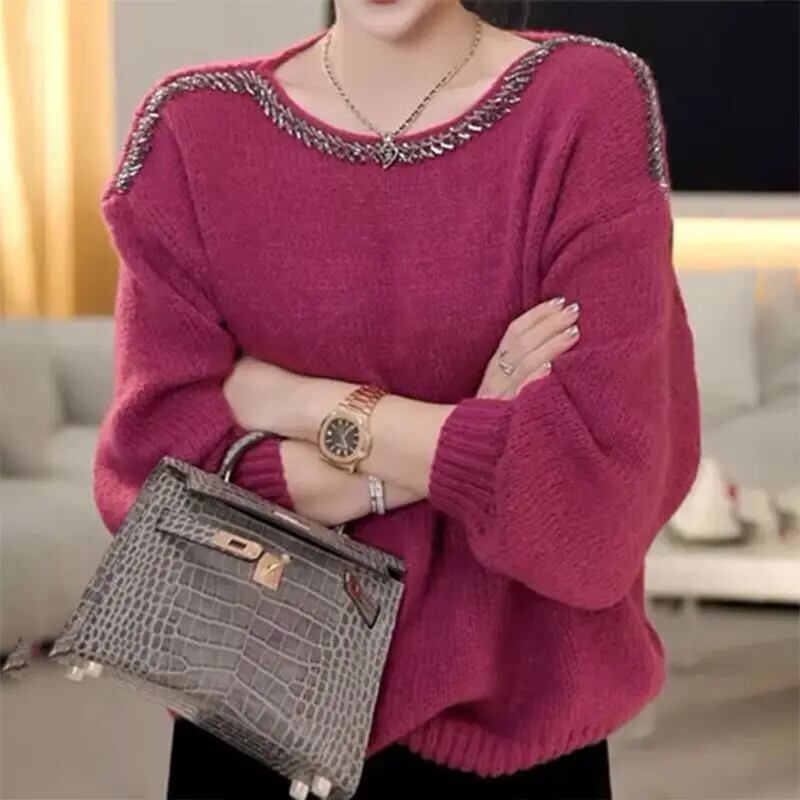 送料無料 O ネックソリッドカラーダイヤモンドブラウス女性の 2023 秋冬ルーズニットオールマッチトップス通勤シャツ オータム 秋物 ウィンター 冬物 Oネック AE1288776655962720108