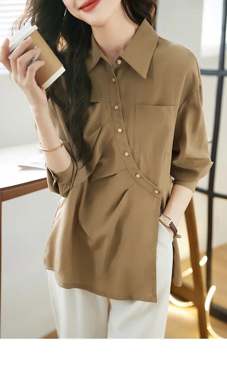 送料無料 ラペルボタンポケット折り不規則なシャツ女性の 2023 秋冬ルーズトップス非対称ブラウス オータム 秋物 ウィンター 冬物 AE1288776633560647548