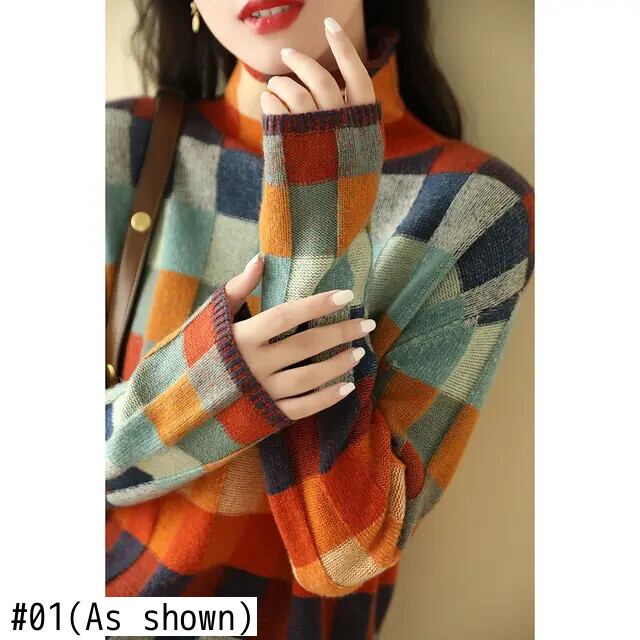 送料無料 スタイリッシュなタートルネックニットスプライシングルーズ格子セーター女性の秋のプルオーバーオールマッチ暖かいトップス オータム 秋物 AE128877669348129415