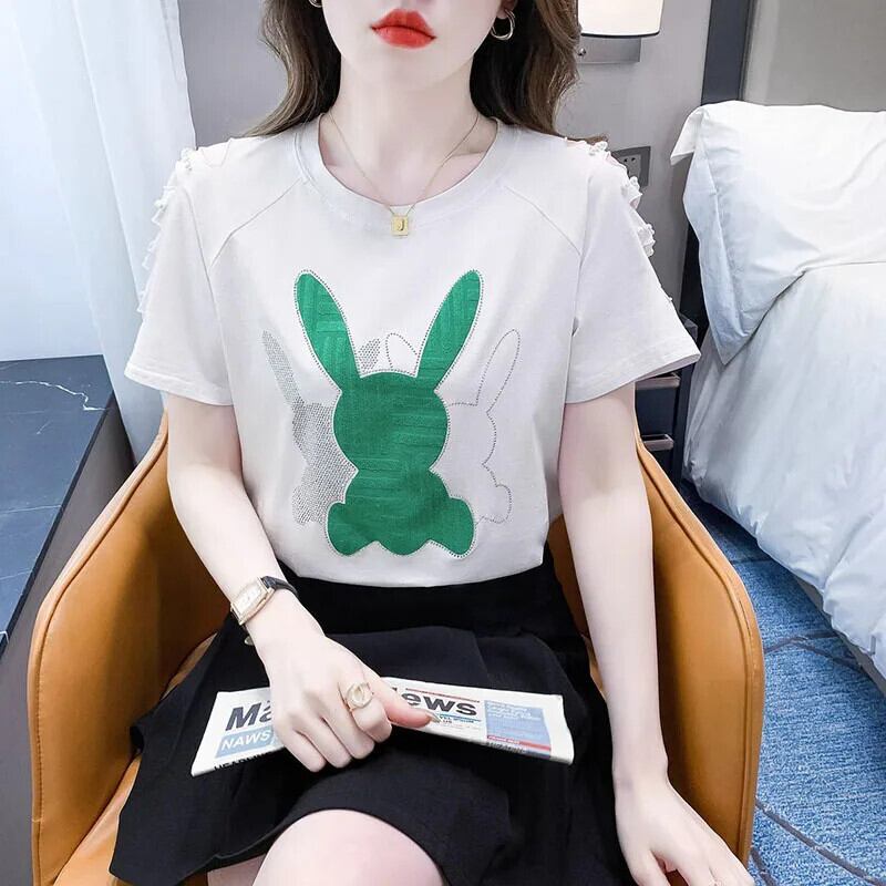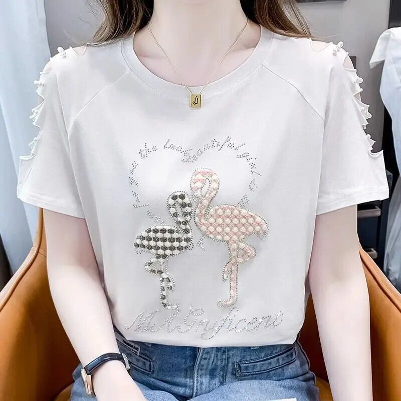 送料無料 O ネックダイヤモンドスプライシングビーズ中空アウト Tシャツ女性の 2024 夏ルーズトップス Tシャツ サマー 夏物 Oネック AE1288776614173089867