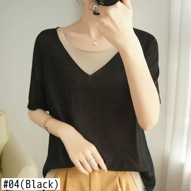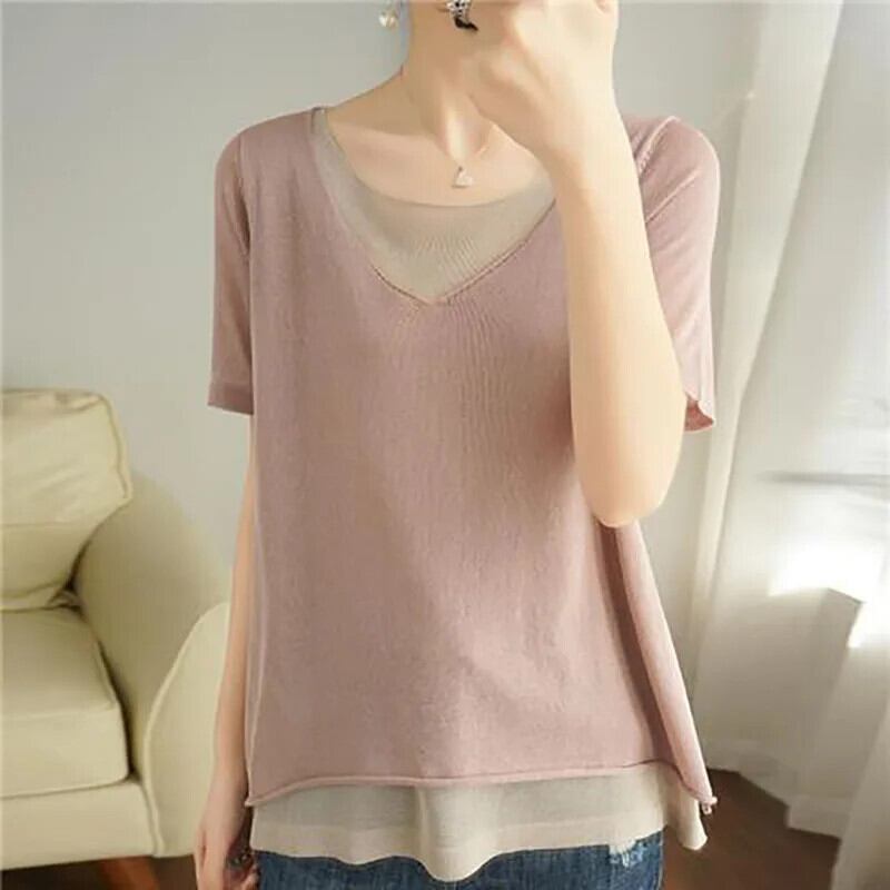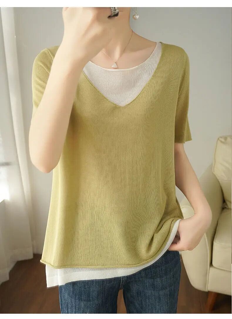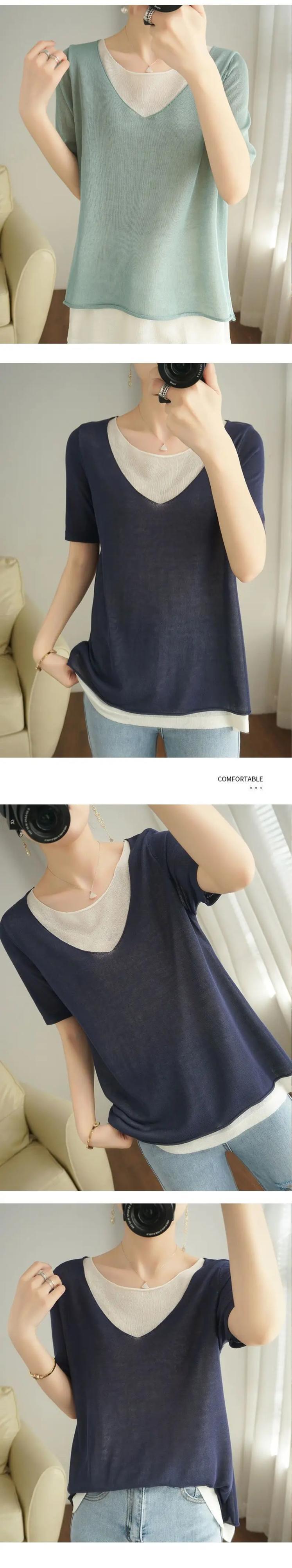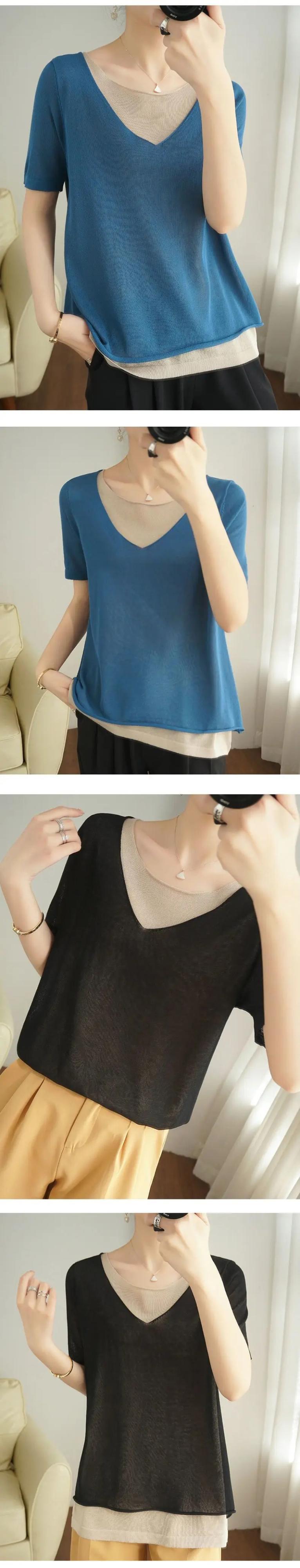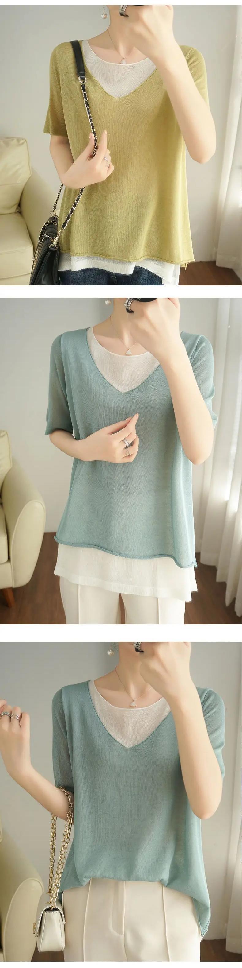 送料無料 V ネックスプライシング不規則なフェイクツーピースブラウス女性の 2023 夏プルオーバー非対称シャツ サマー 夏物 Vネック AE1288776697254129037