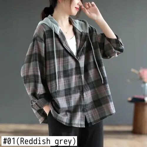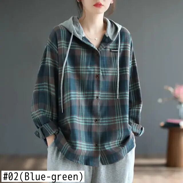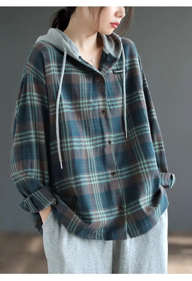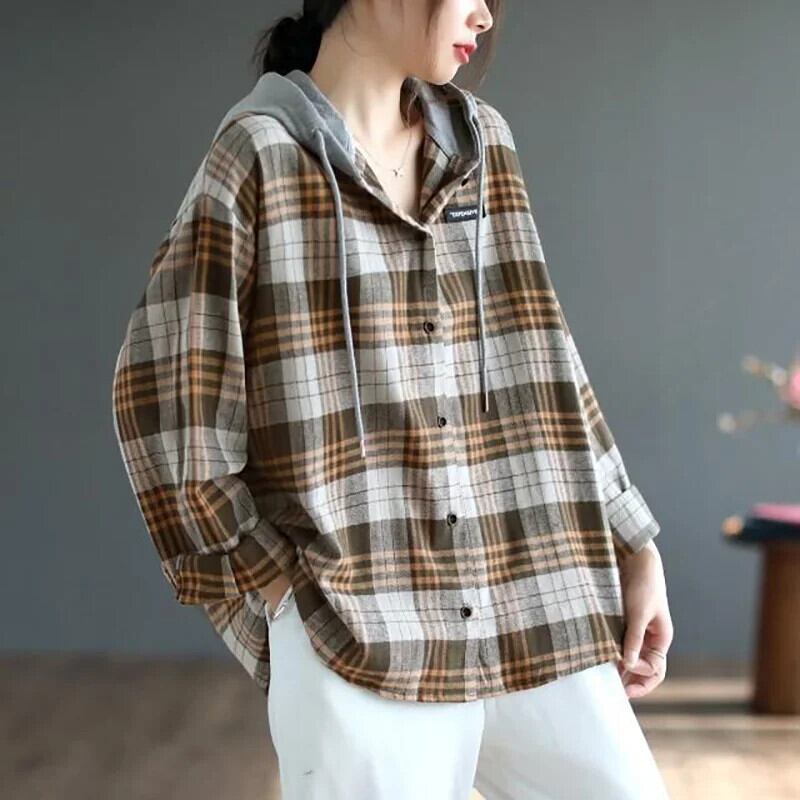 送料無料 フード付きボタンスプライシング格子 Tシャツ女性の 2022 秋ルーズプルオーバーオールマッチ Tシャツ オータム 秋物 AE1288776682285774175