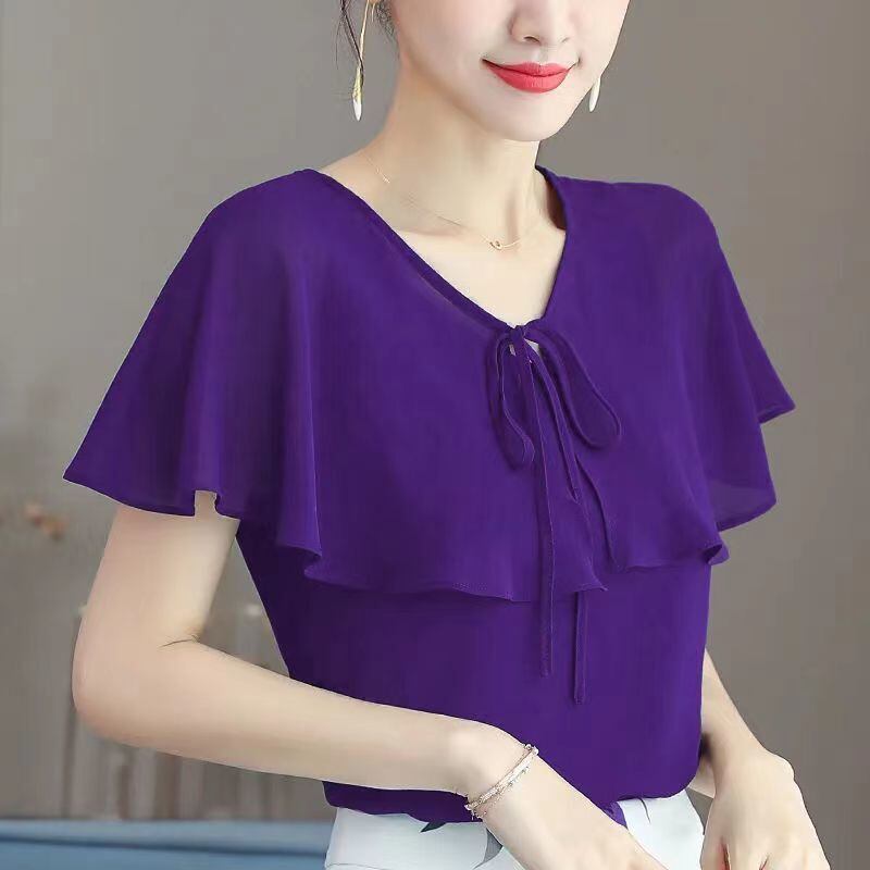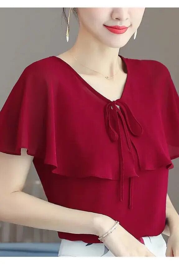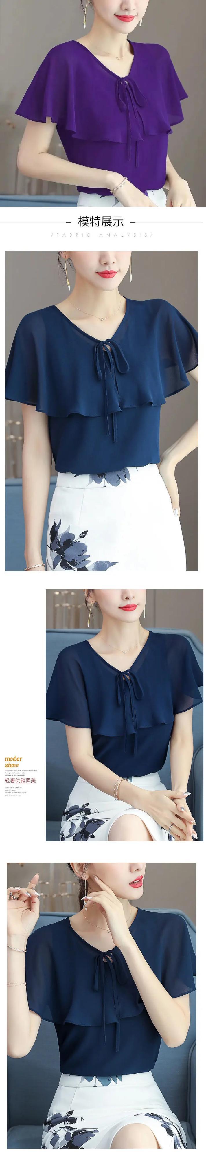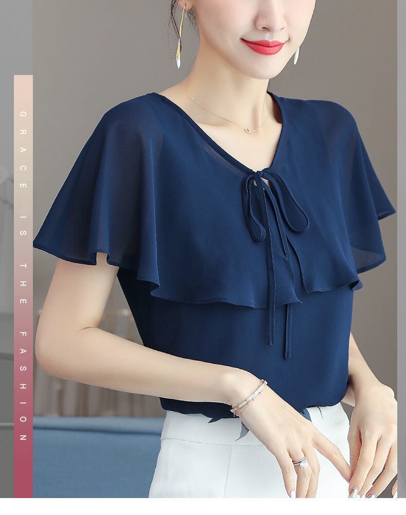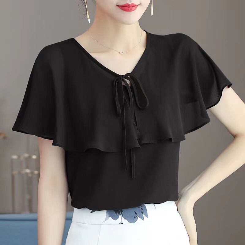 送料無料 V ネックフリルレースアップリボン特大シフォンブラウス 2022 夏プルオーバールーズ通勤女性のシル ラッフル サマー 夏物 Vネック AE128877668898233556