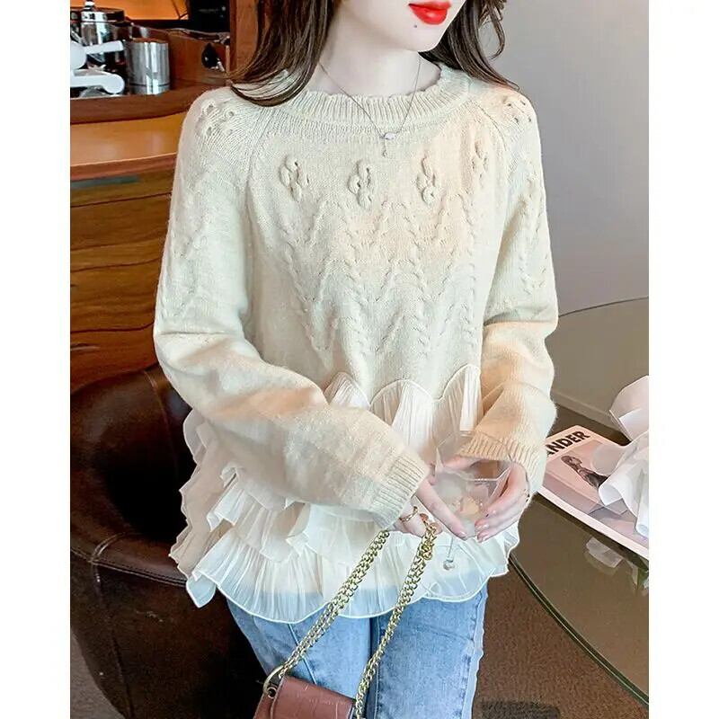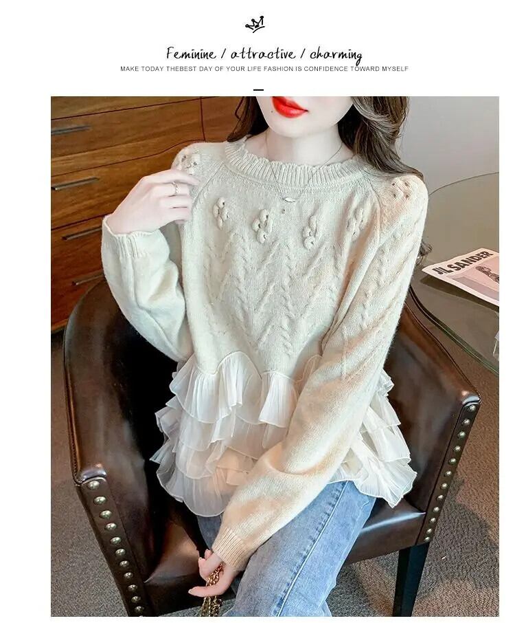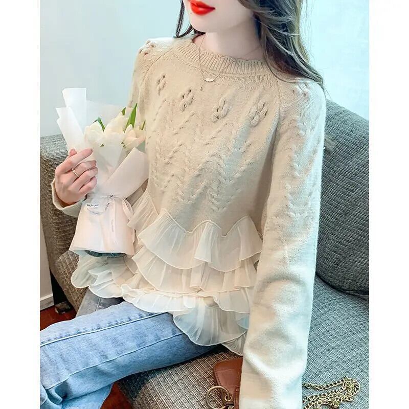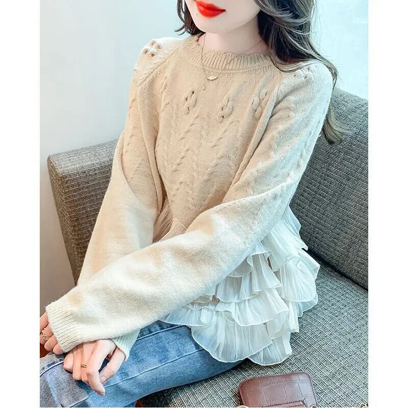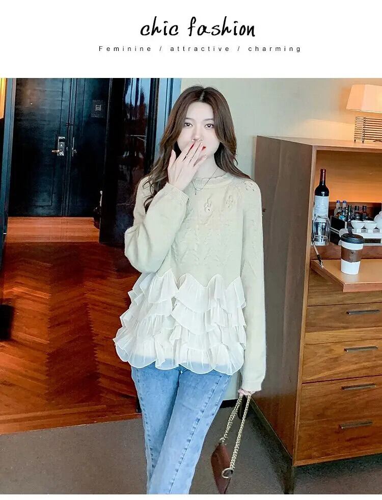 送料無料 甘い O ネックソリッドカラースプライシングフリルセーター 2024 春ルーズニットプルオーバー不規則なトップス ラッフル 大人ガーリー スウィート キュート カジュアル スプリング 春物 Oネック AE1288776627970832466