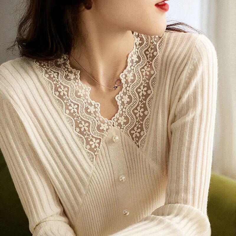 送料無料 V ネックスプライシングビーズレース中空アウトブラウス女性 2022 秋プルオーバーオールマッチオフィスレディシャツ オータム 秋物 Vネック 会社 学校 通勤や通学にも AE1288776662789071001