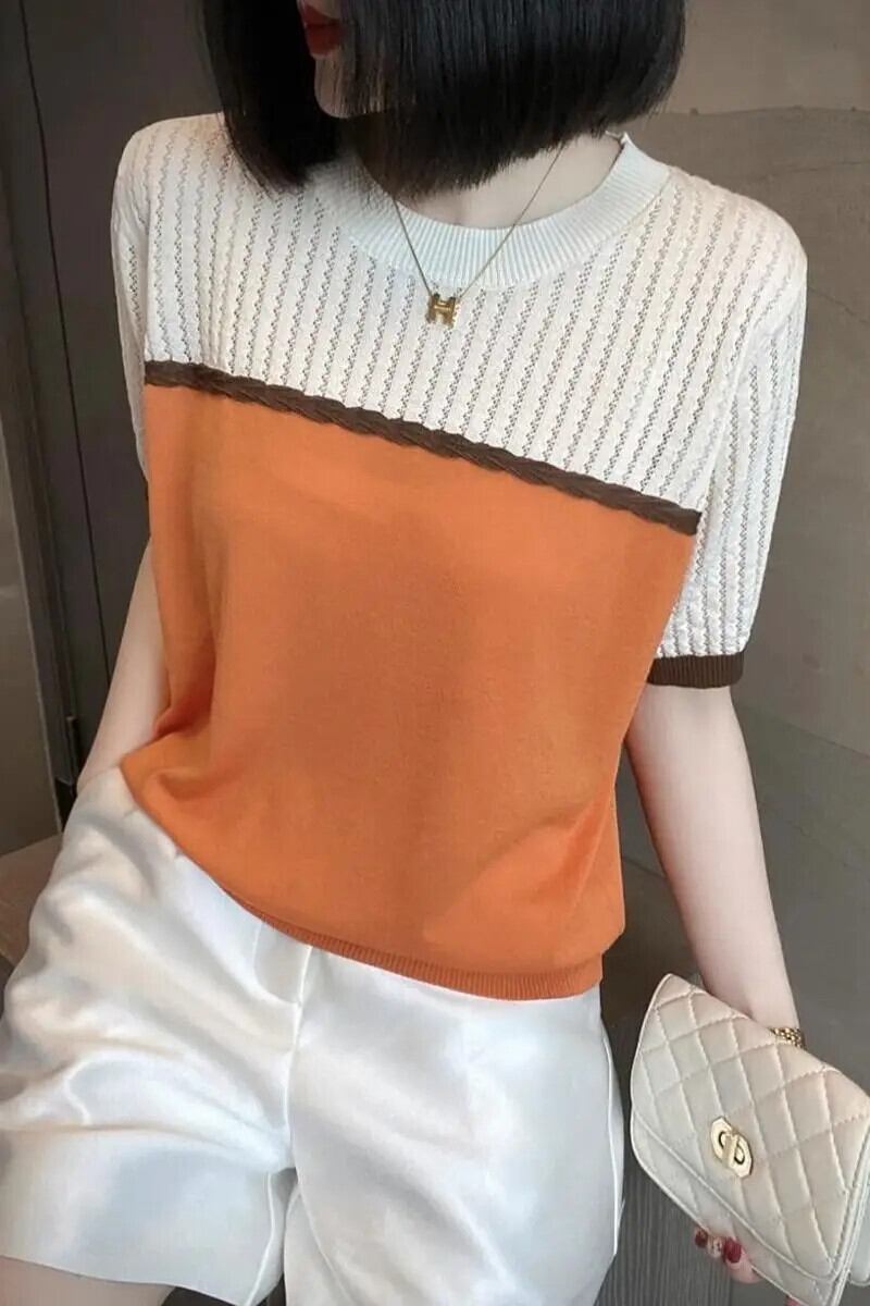送料無料 O ネック半袖スプライス中空アウト Tシャツ女性の 2024 夏ルーズ通勤トップス Tシャツ ショート ハーフスリーブ サマー 夏物 Oネック AE1288776614660686373