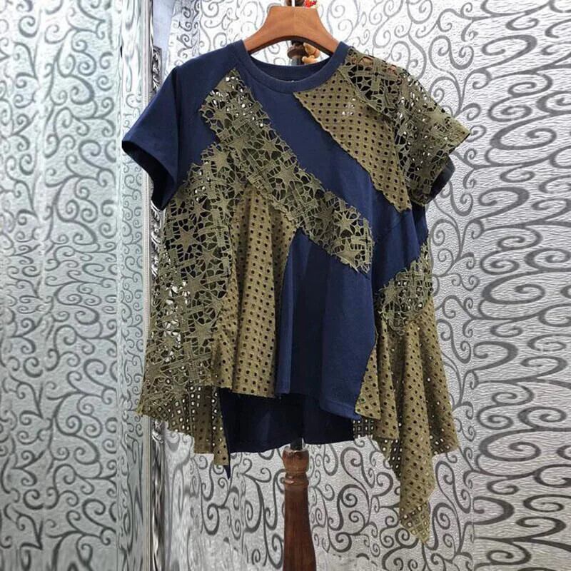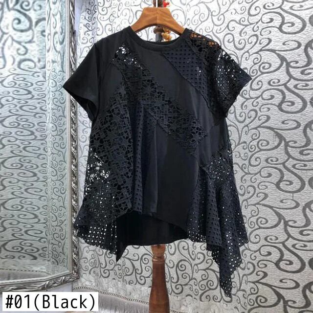送料無料 O ネックスプライスレース中空アウト不規則なブラウス女性の 2023 夏プルオーバー非対称シャツ サマー 夏物 Oネック AE1288776650798861261