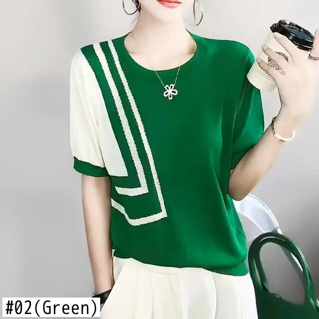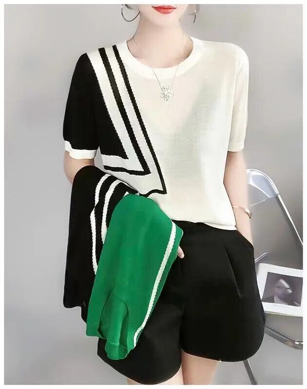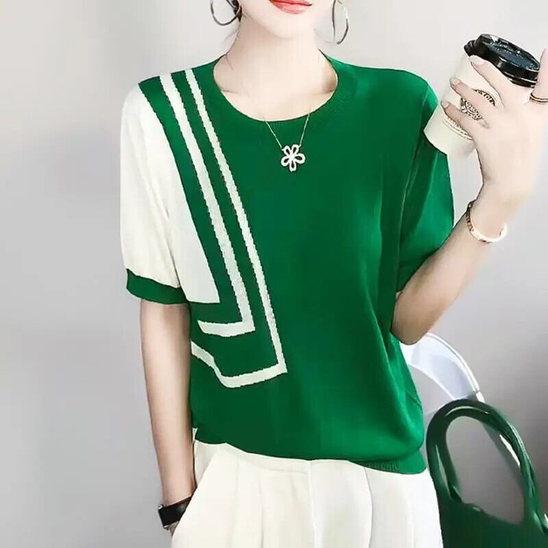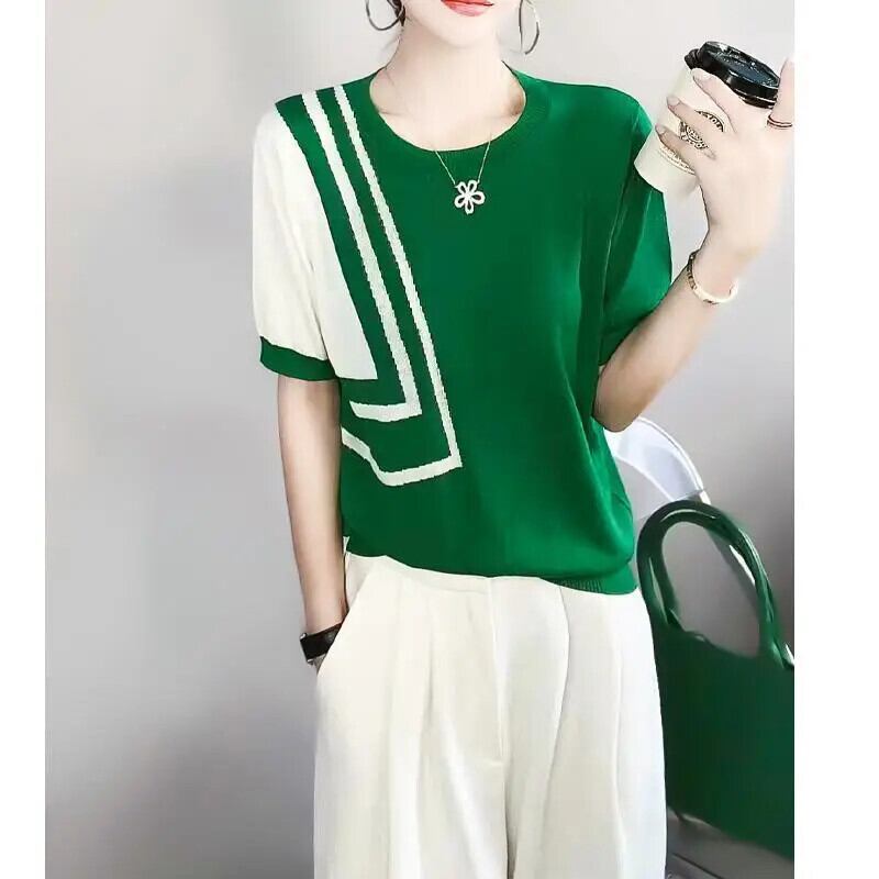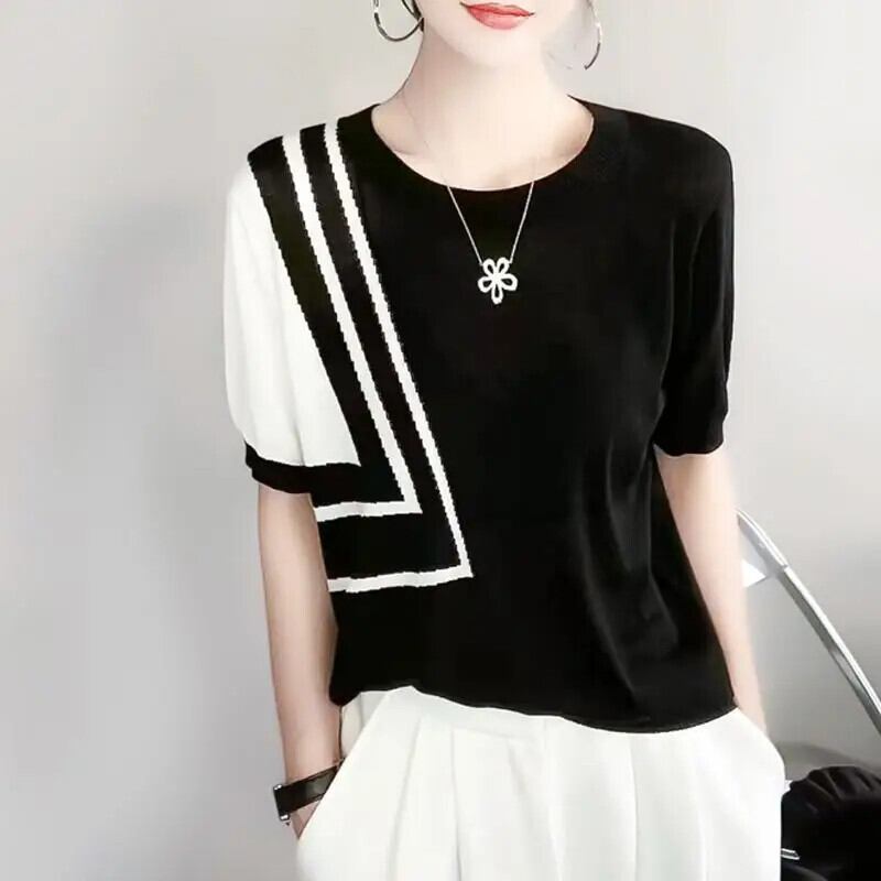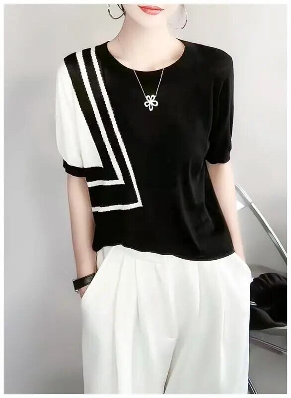 送料無料 O ネックニット半袖非対称 Tシャツ女性 2024 夏ルーズトップスオフィスレディ Tシャツ ショート ハーフスリーブ サマー 夏物 Oネック 会社 学校 通勤や通学にも AE1288776690654041355