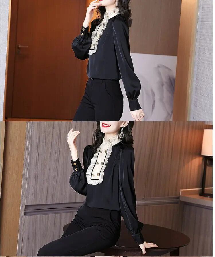 送料無料 スタンドカラースプライシングフリルボタンブラウス 2022 秋通勤トップス長袖オールマッチ女性のシャツ ロング ラッフル オータム 秋物 AE1288776654354275970
