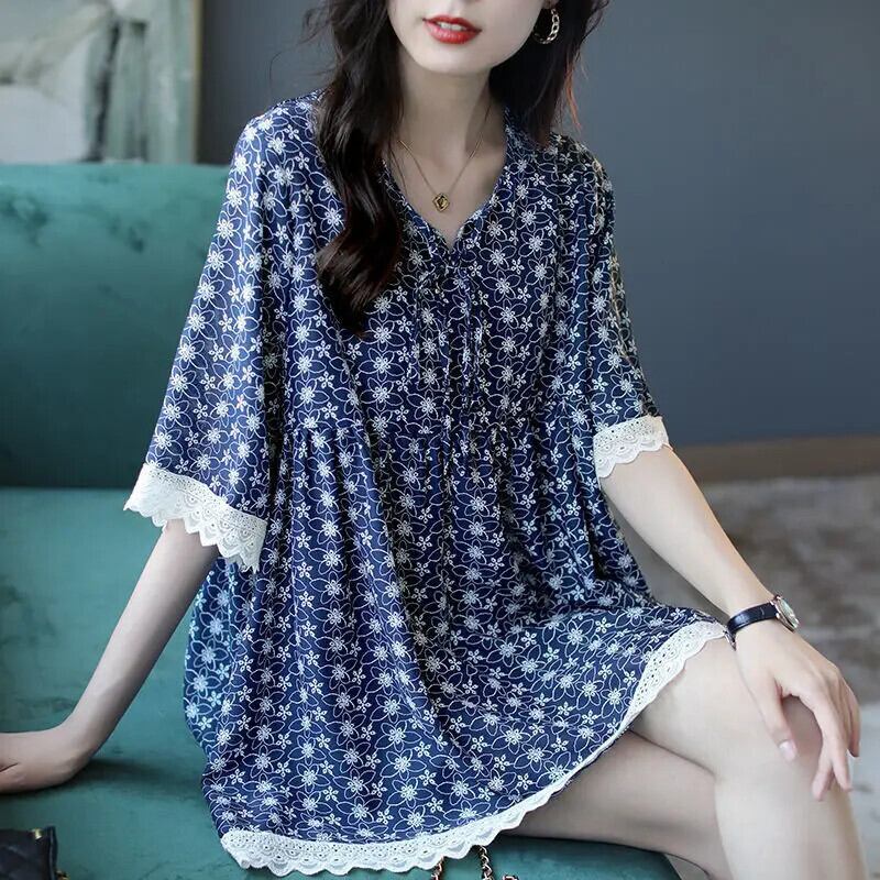 送料無料 プリントスプライシングレースフリルレースアップボウフローラルブラウス女性の 2023 夏プルオーバーシャツ リボン ラッフル サマー 夏物 花柄 AE1288776616433973365