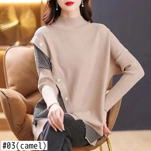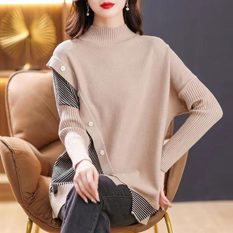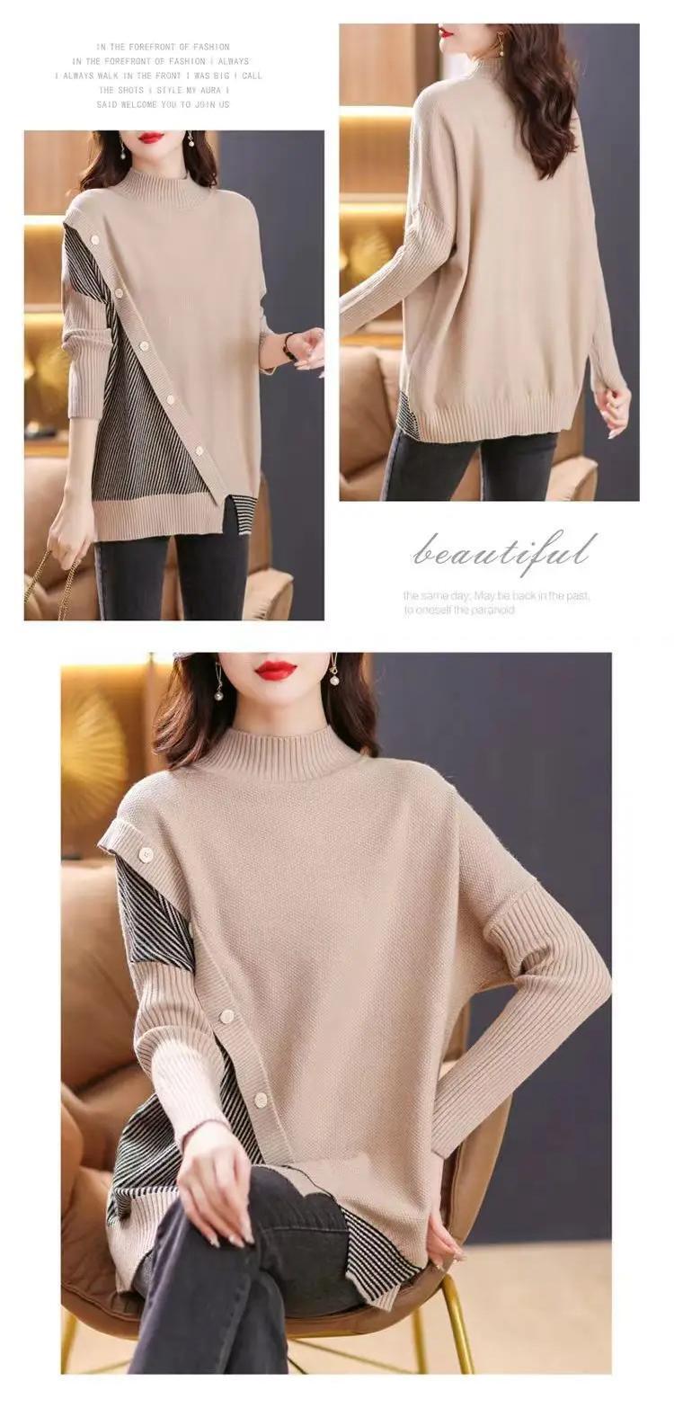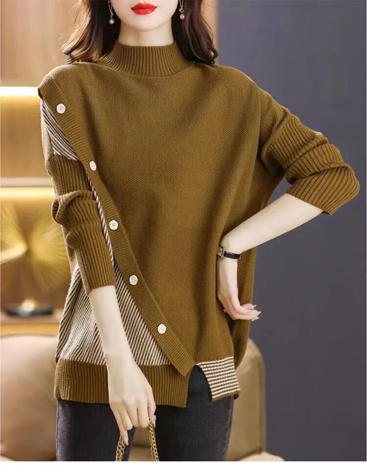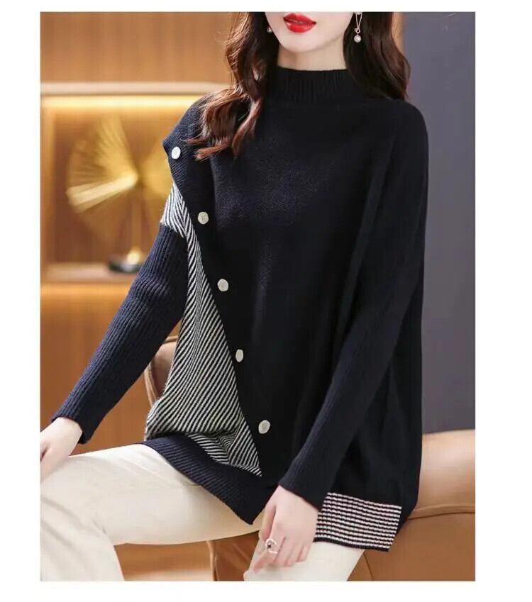 送料無料 スプライスボタンストライプ非対称セーター女性の 2023 秋冬ルーズプルオーバー不規則なトップス オータム 秋物 ウィンター 冬物 AE1288776621209449153