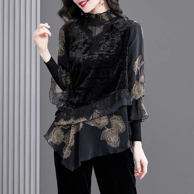 送料無料 ヴィンテージフリルプリント偽二枚シフォンシャツ女性 2022 春レースフランネルパッチワークルーズ特大ブラウス スプリング 春物 ビンテージ AE128877662053312821