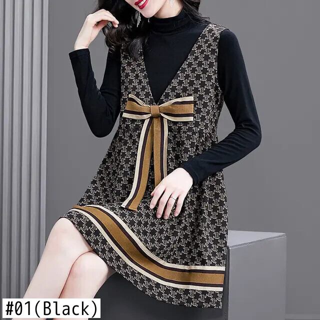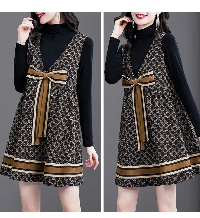 送料無料 スタンドカラールーズプリントリボンミニドレス女性の 2023 秋冬特大オフィスレディドレス オータム 秋物 ウィンター 冬物 会社 学校 通勤や通学にも AE1288776629324027326
