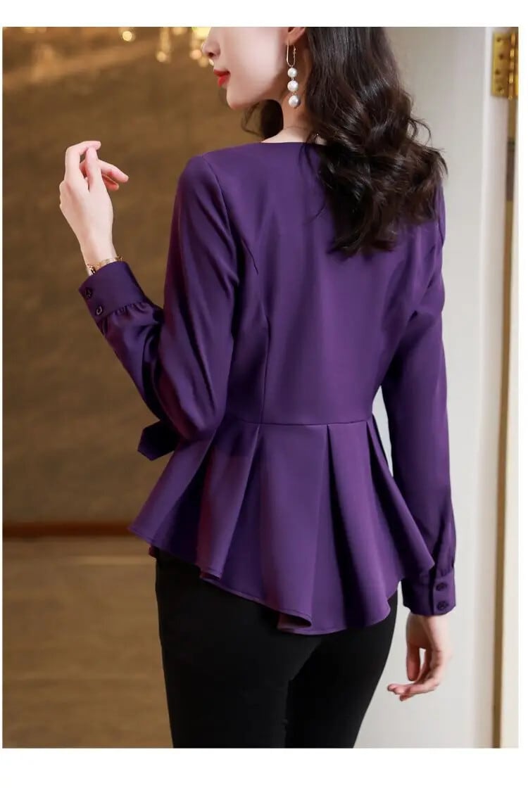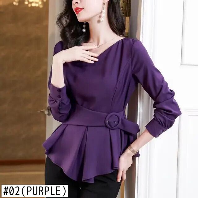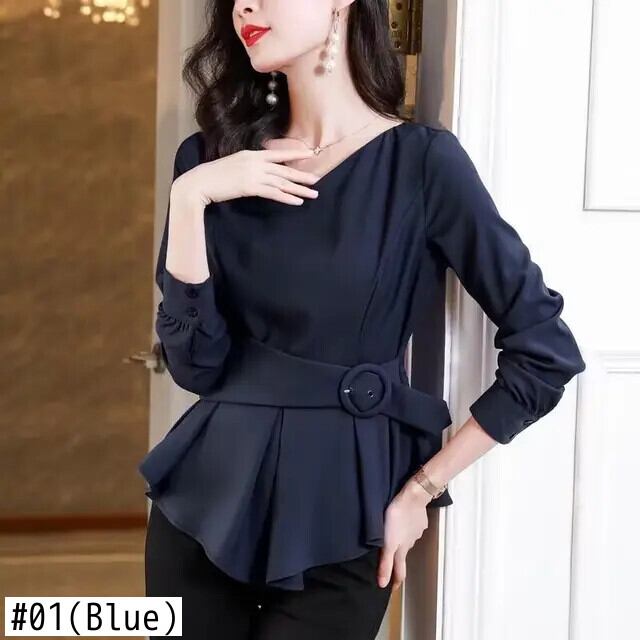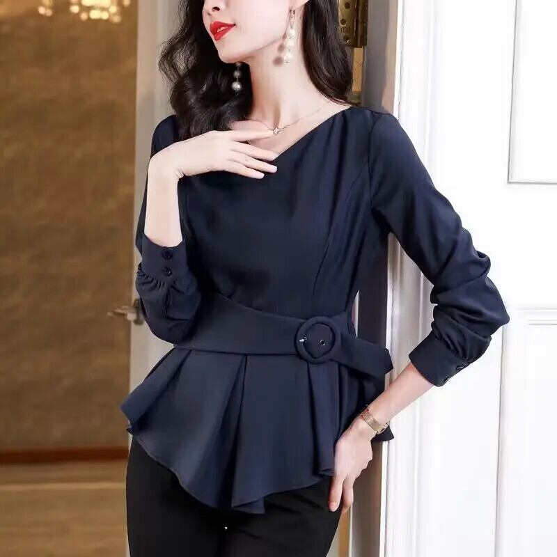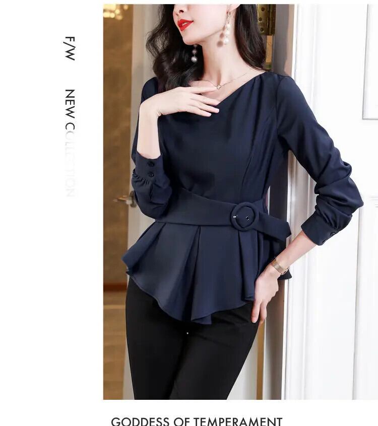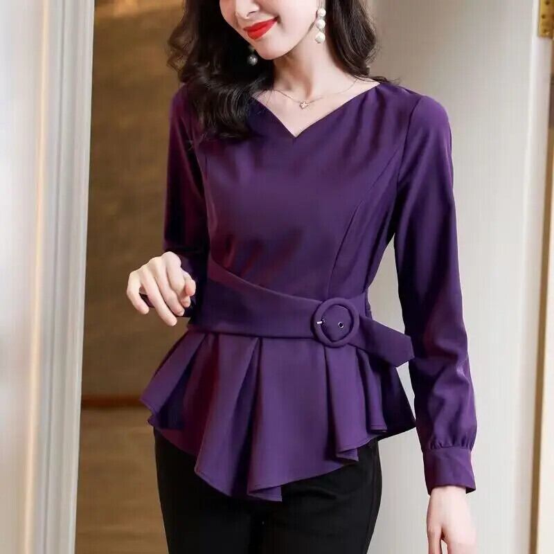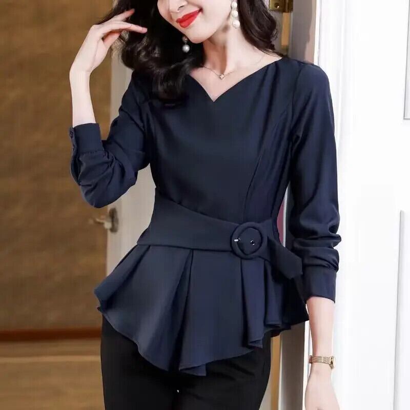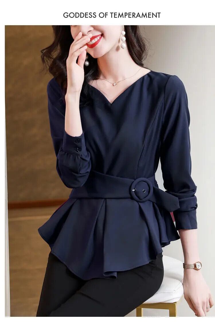 送料無料 V ネックソリッドカラーひだサッシュ不規則なブラウス女性の 2023 秋ルーズトップスオフィスレディシャツ オータム 秋物 Vネック 会社 学校 通勤や通学にも AE1288776698647684552