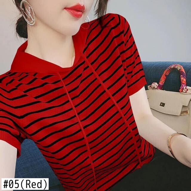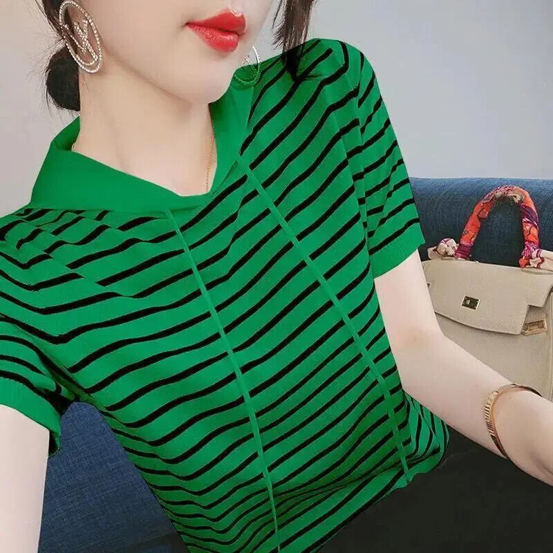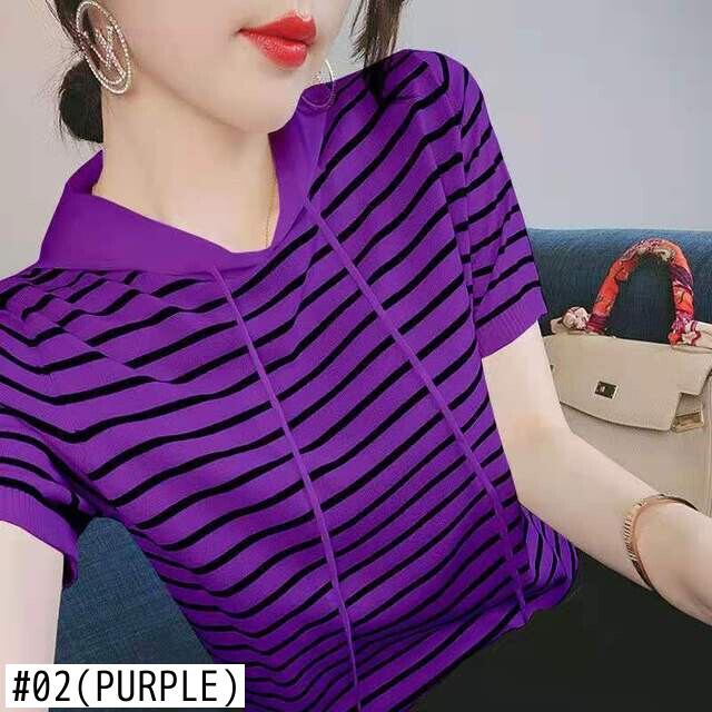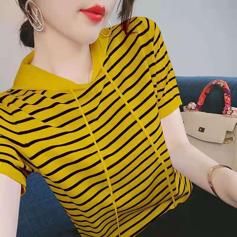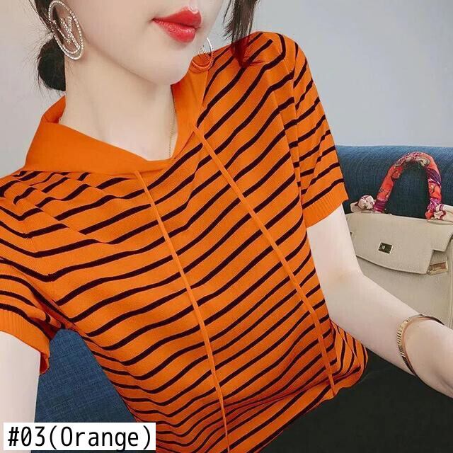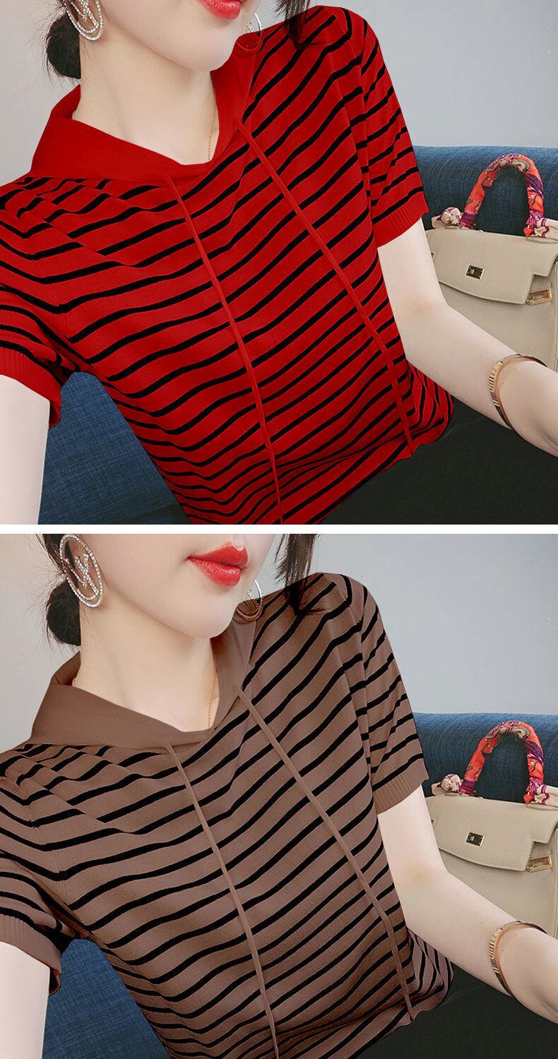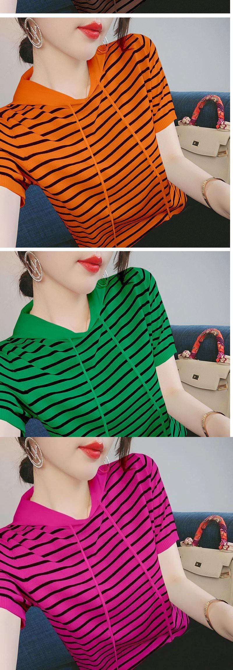送料無料 ストライププリントスプライスフード付き特大ブラウス2022夏プルオーバールーズ通勤シャツ サマー 夏物 AE1288776680033195097