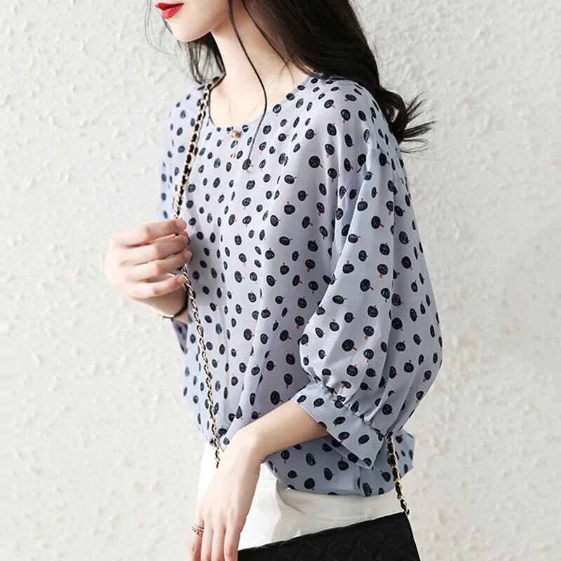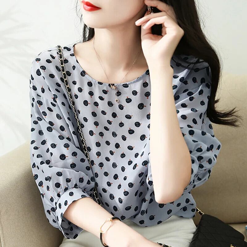送料無料 ヴィンテージプリント水玉 O ネックルーズランタンスリーブシフォンシャツ夏プルオーバー特大女性ブラウス 2022 サマー 夏物 Oネック ビンテージ AE1288776691308809590
