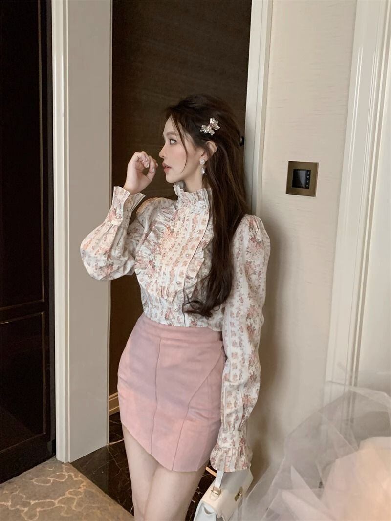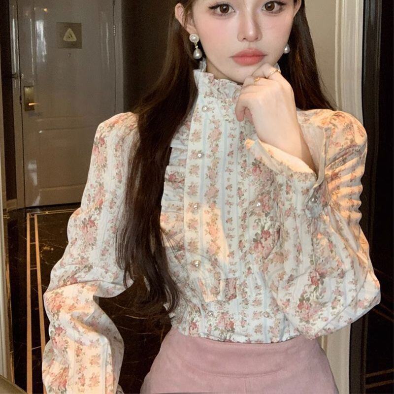 送料無料 甘いプリントボタンフリルスリーブシャツ 2024 春ルーズトップスオフィスレディブラウス ラッフル 大人ガーリー スウィート キュート カジュアル スプリング 春物 会社 学校 通勤や通学にも AE1288776687130195864