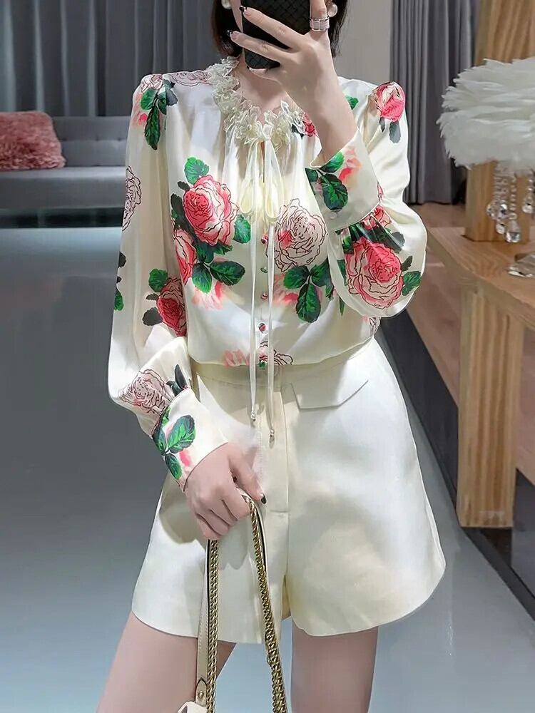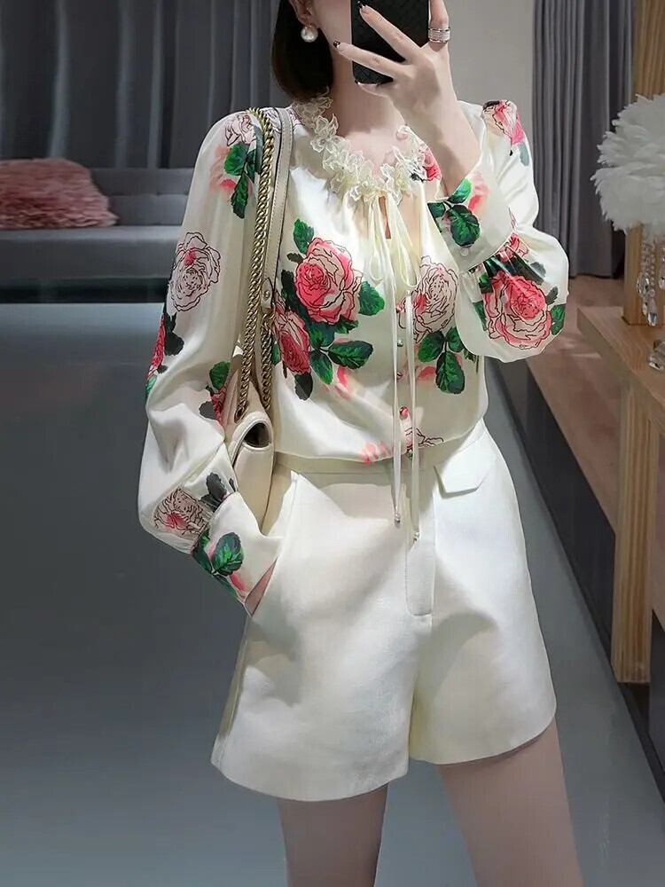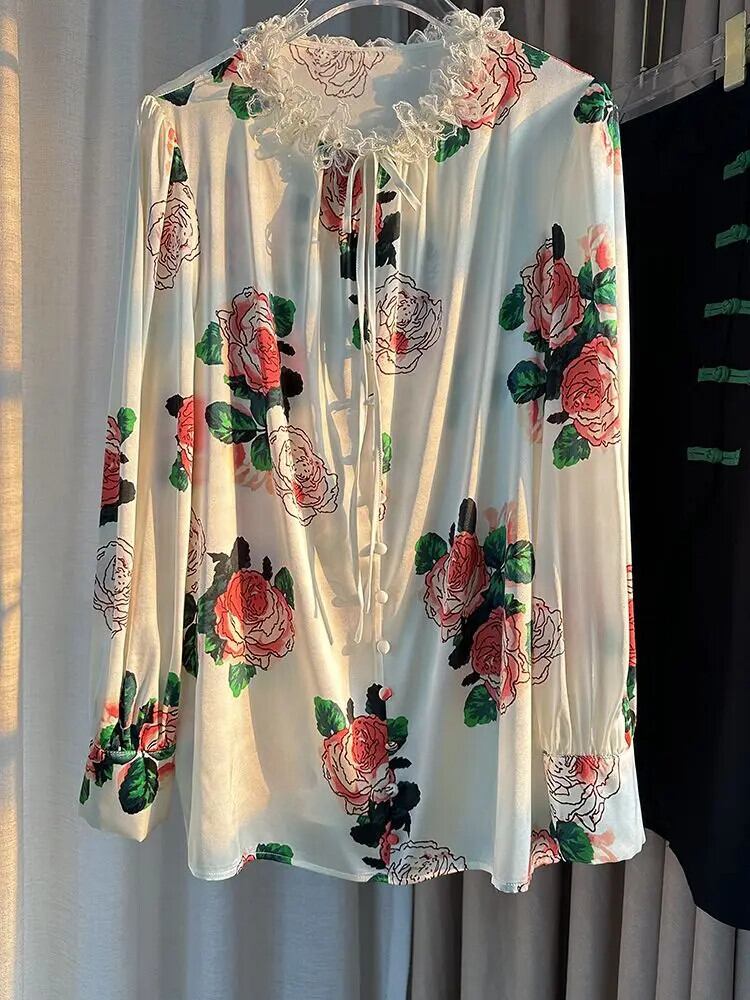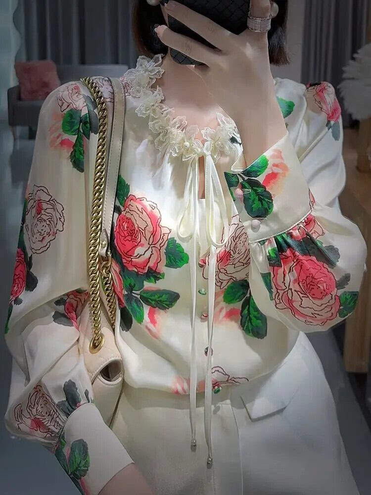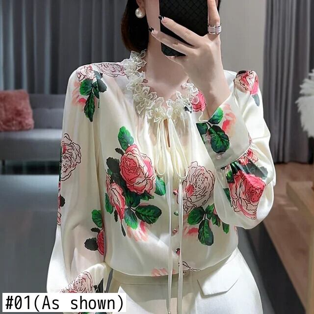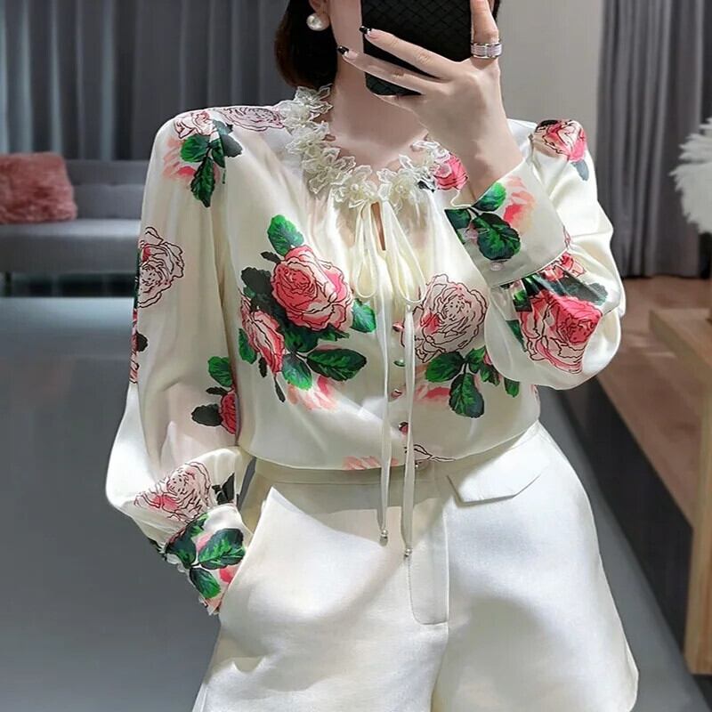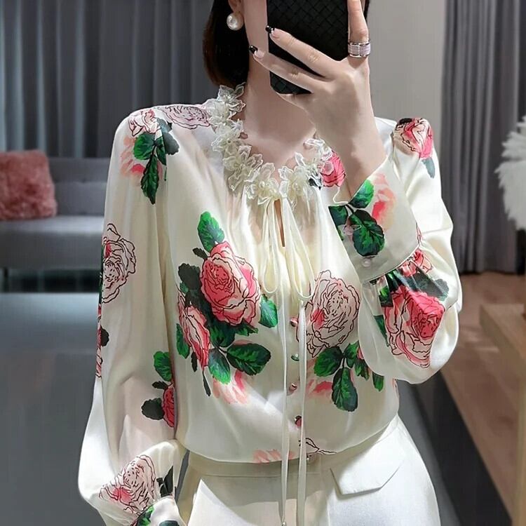 送料無料 ヴィンテージプリントビーズレースレースアップボウブラウス女性の 2023 秋冬オールマッチトップスオフィスレディシャツ リボン オータム 秋物 ウィンター 冬物 ビンテージ 会社 学校 通勤や通学にも AE1288776687607226249