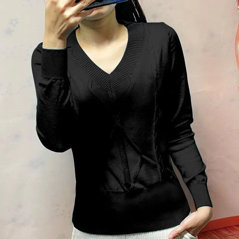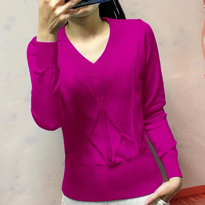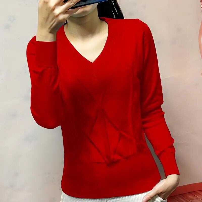 送料無料 V ネックソリッドカラー折り目ニットセーター女性の 2023 秋冬ルーズプルオーバートップス オータム 秋物 ウィンター 冬物 Vネック AE1288776616243219290