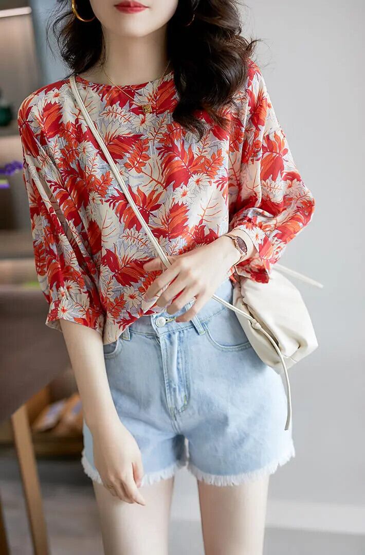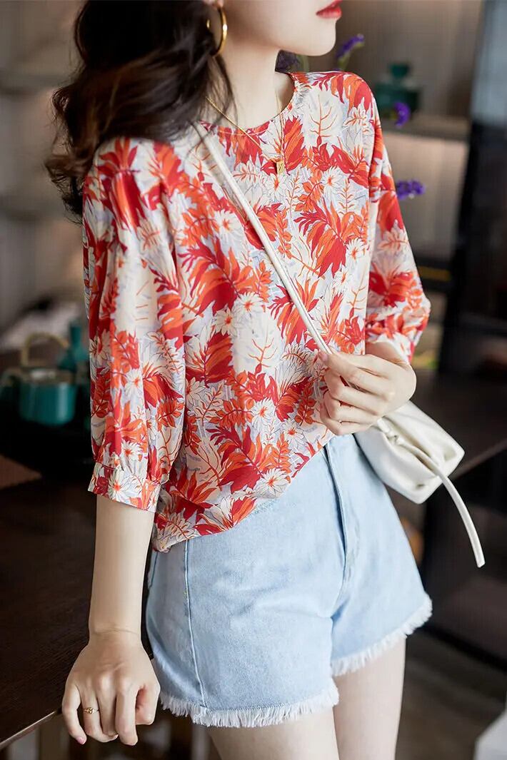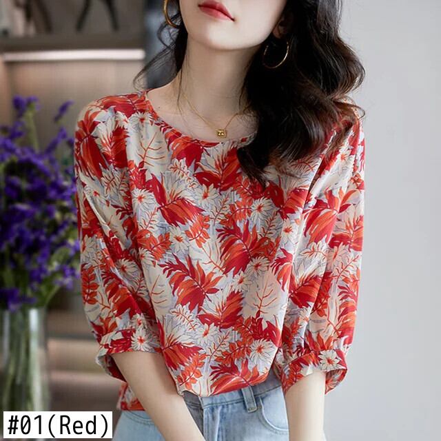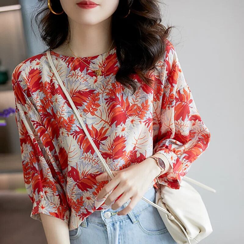 送料無料 ヴィンテージプリント O ネックランタンスリーブ特大シフォンシャツ 2022 夏プルオーバールーズ通勤女性のブラウス サマー 夏物 Oネック ビンテージ AE1288776684069847491
