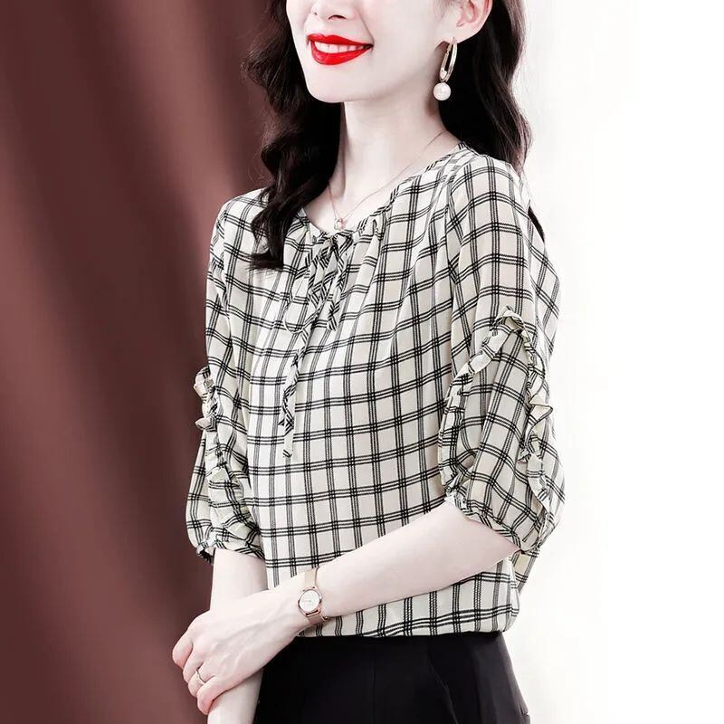 送料無料 プリントスプライシングフリルボウチェック柄シフォンブラウス女性の 2023 夏オーバーサイズトップスオールマッチシャツ リボン ラッフル サマー 夏物 AE1288776680525861844