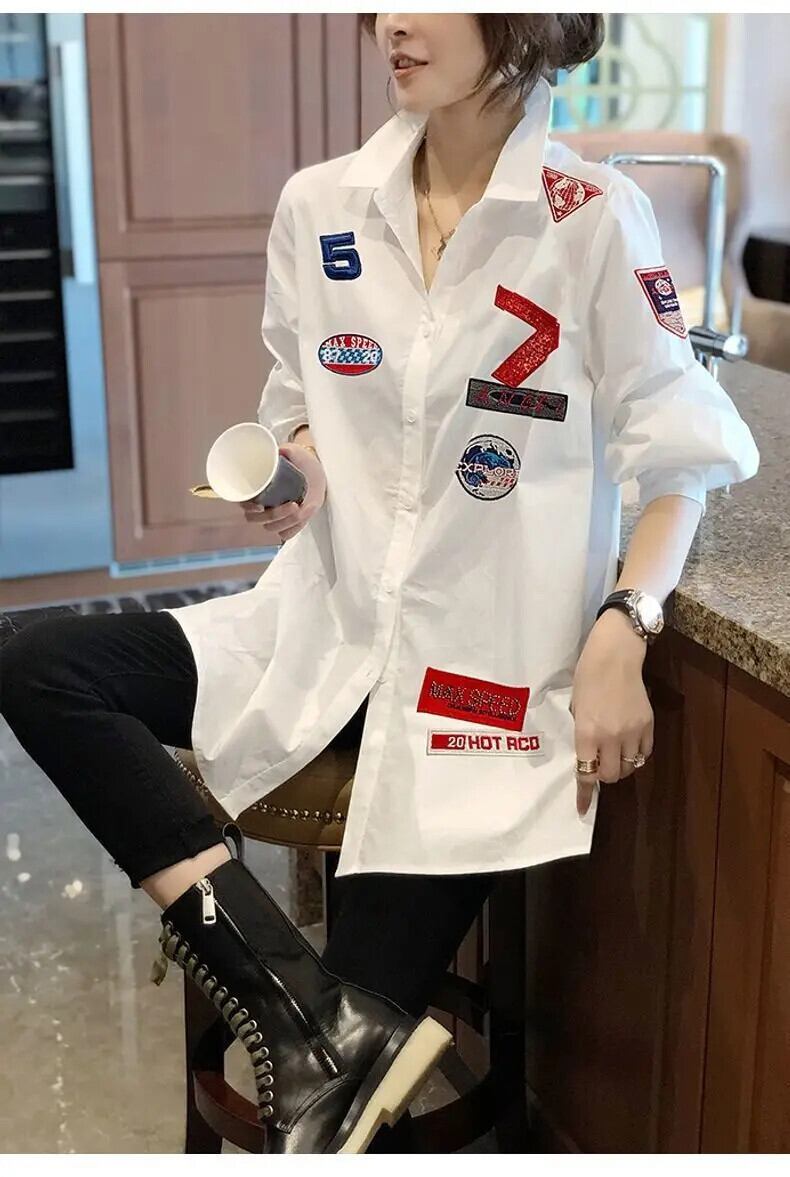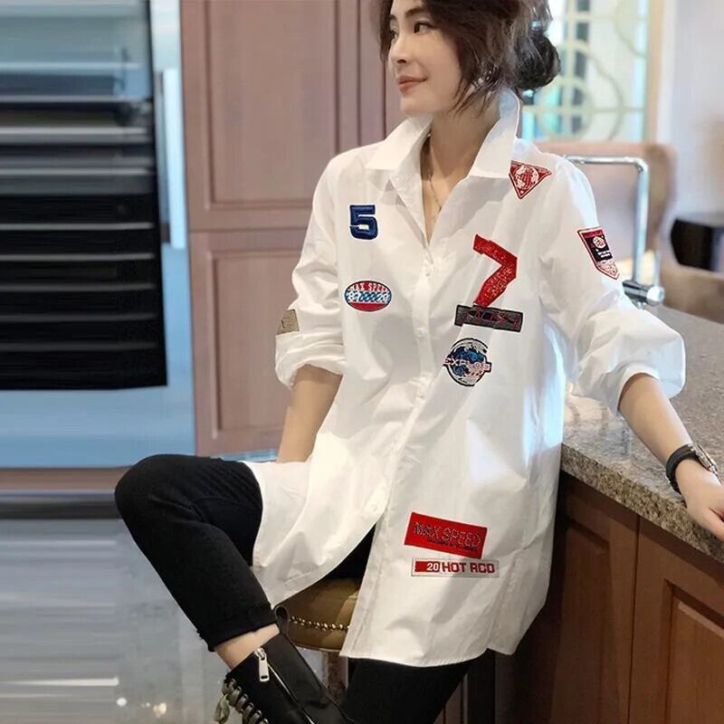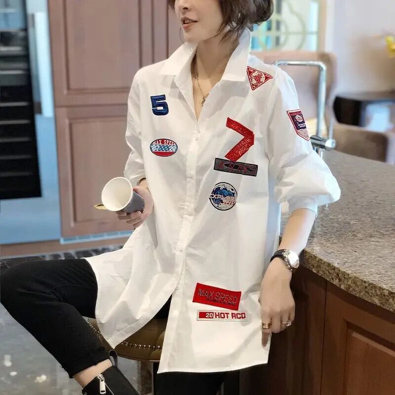 送料無料 ラペルボタンスプライス文字刺繍シャツ女性の 2022 秋特大トップスルーズブラウス オータム 秋物 AE1288776629757609101