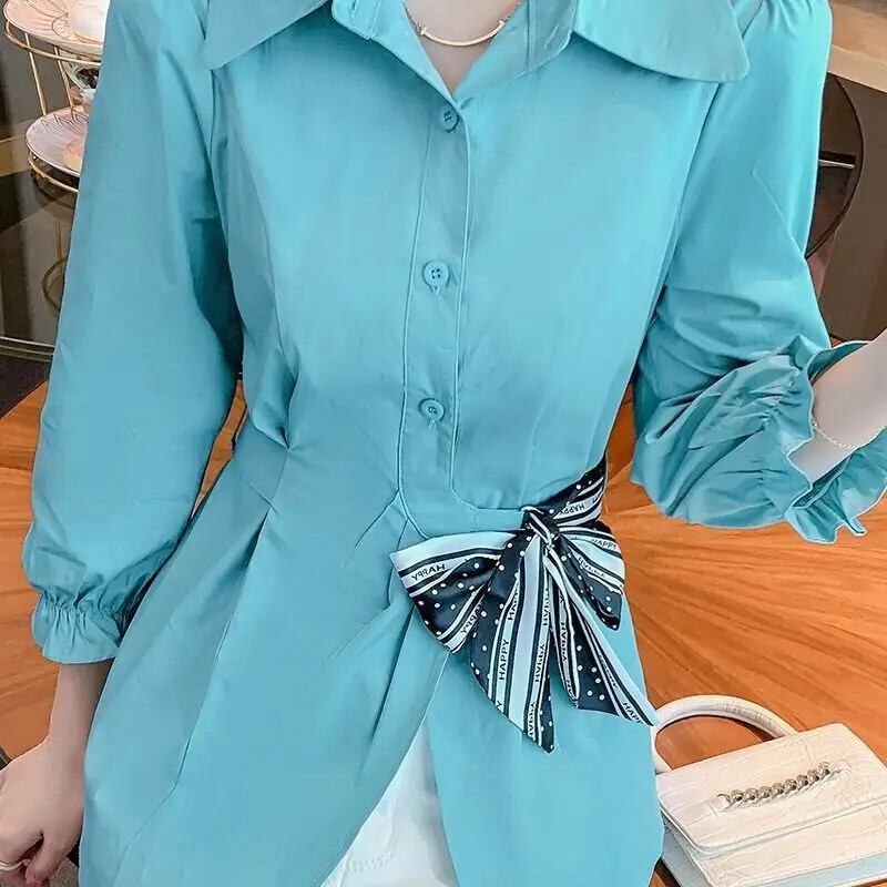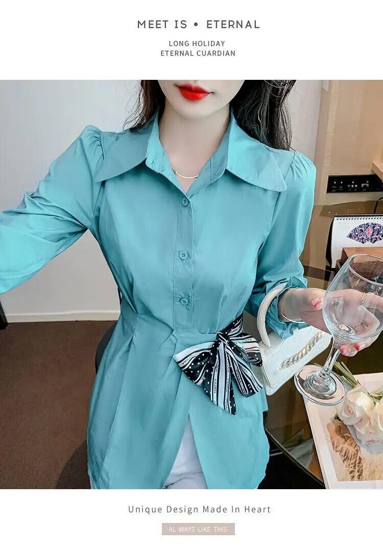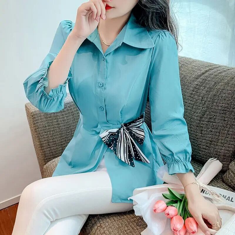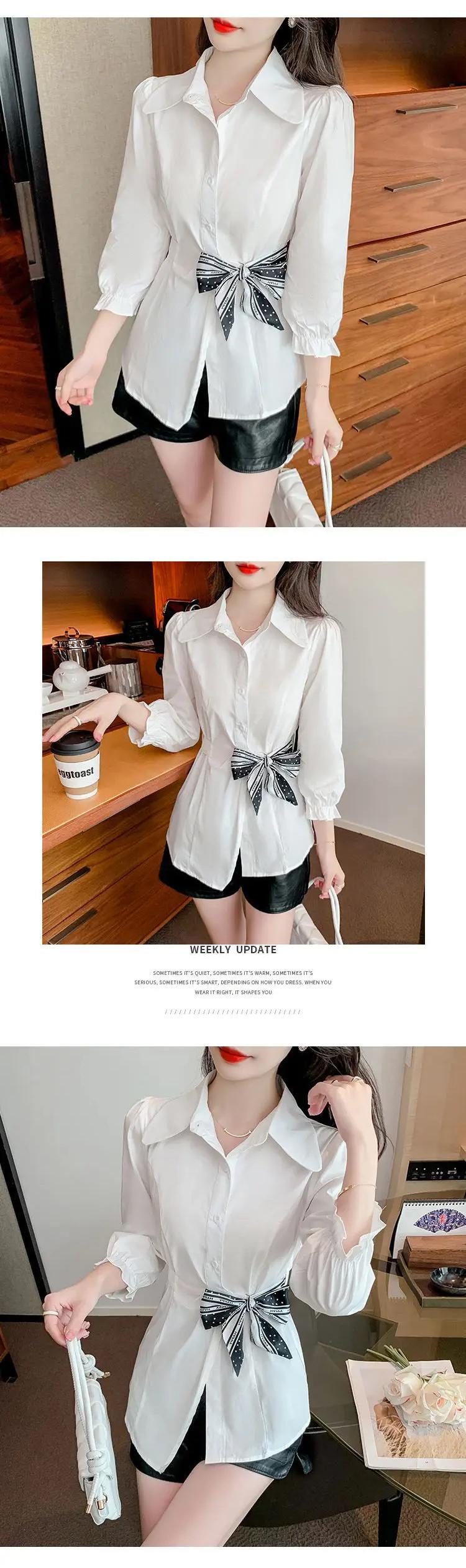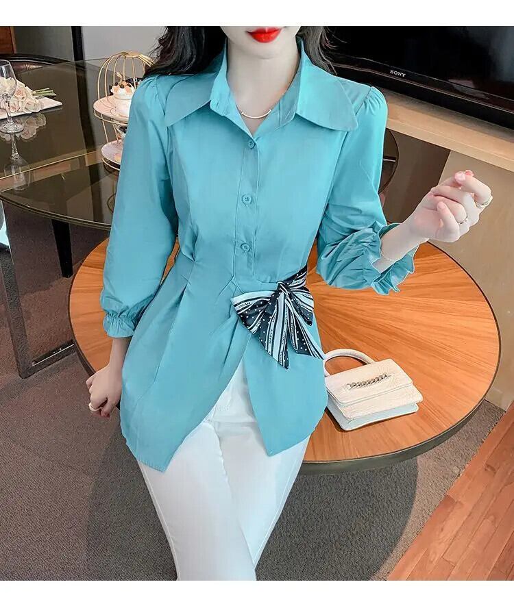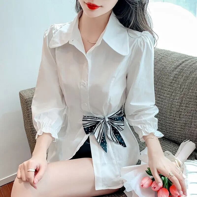 送料無料 ラペルひだ包帯ボウパフスリーブシャツ女性の 2024 春夏ルーズトップスオフィスレディブラウス リボン スプリング 春物 サマー 夏物 会社 学校 通勤や通学にも AE1288776638459935786