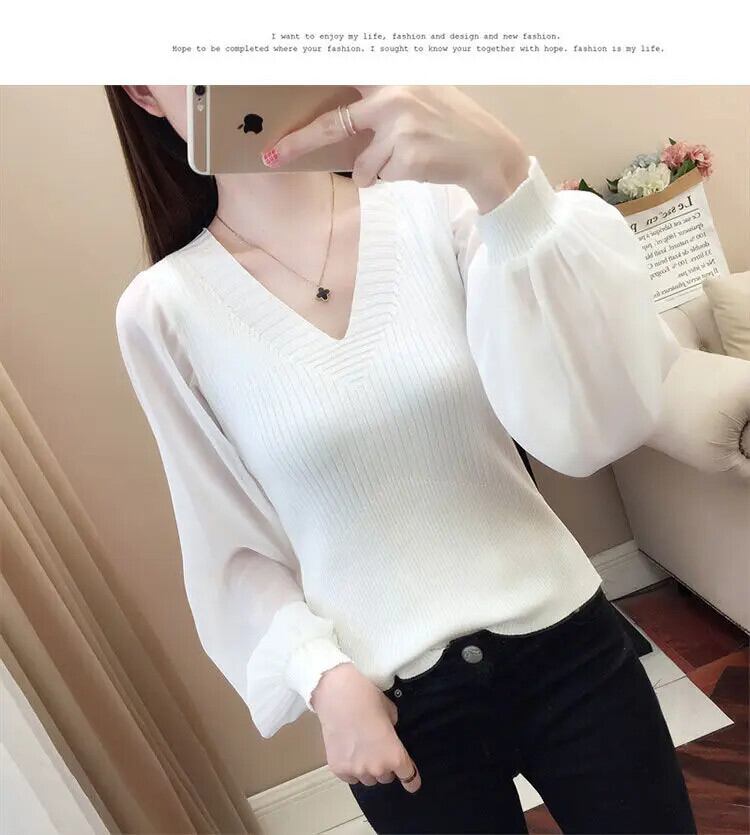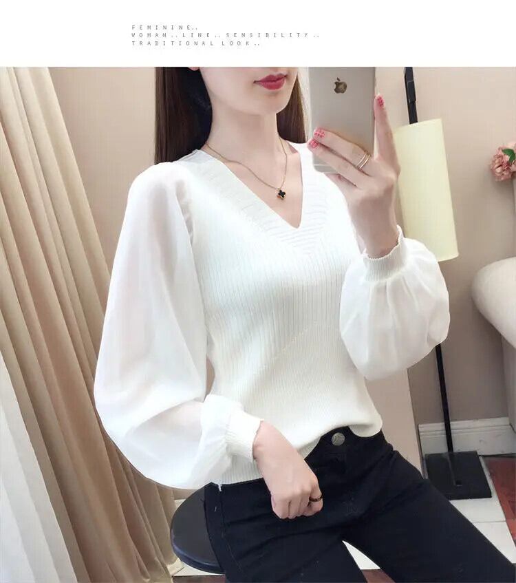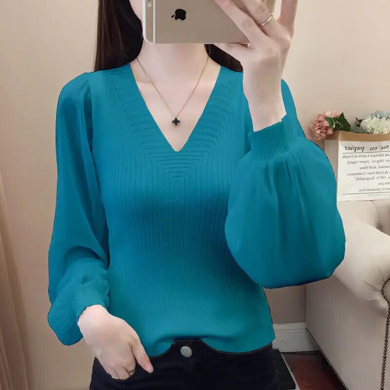 送料無料 ソリッドカラー V ネックスプライシング特大ランタンスリーブブラウス 2022 秋通勤女性のルーズシャツ オータム 秋物 Vネック AE1288776634977497668