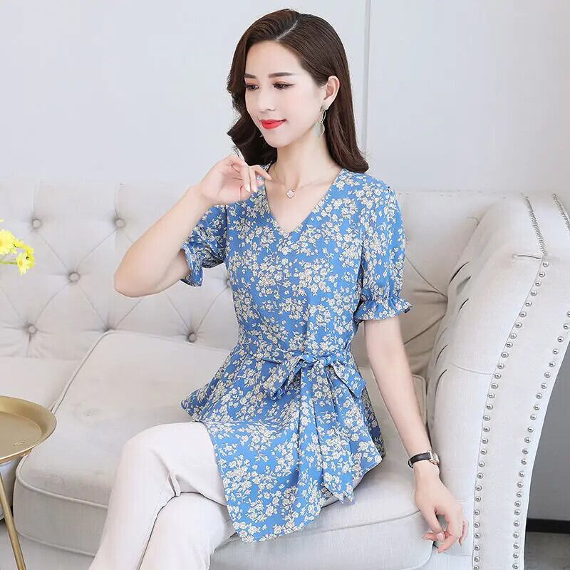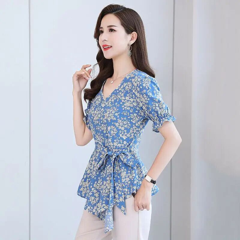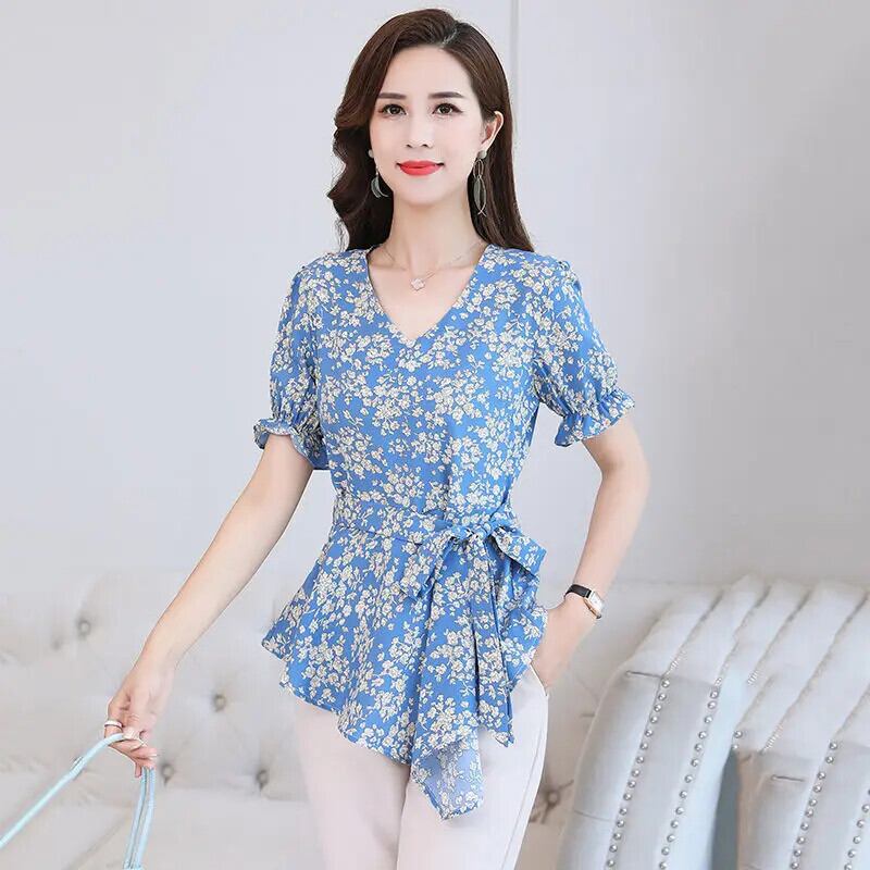 送料無料 フリルひだ包帯弓不規則な花柄ブラウス女性の 2023 夏ルーズトップス非対称シャツ リボン ラッフル サマー 夏物 AE1288776699397653048
