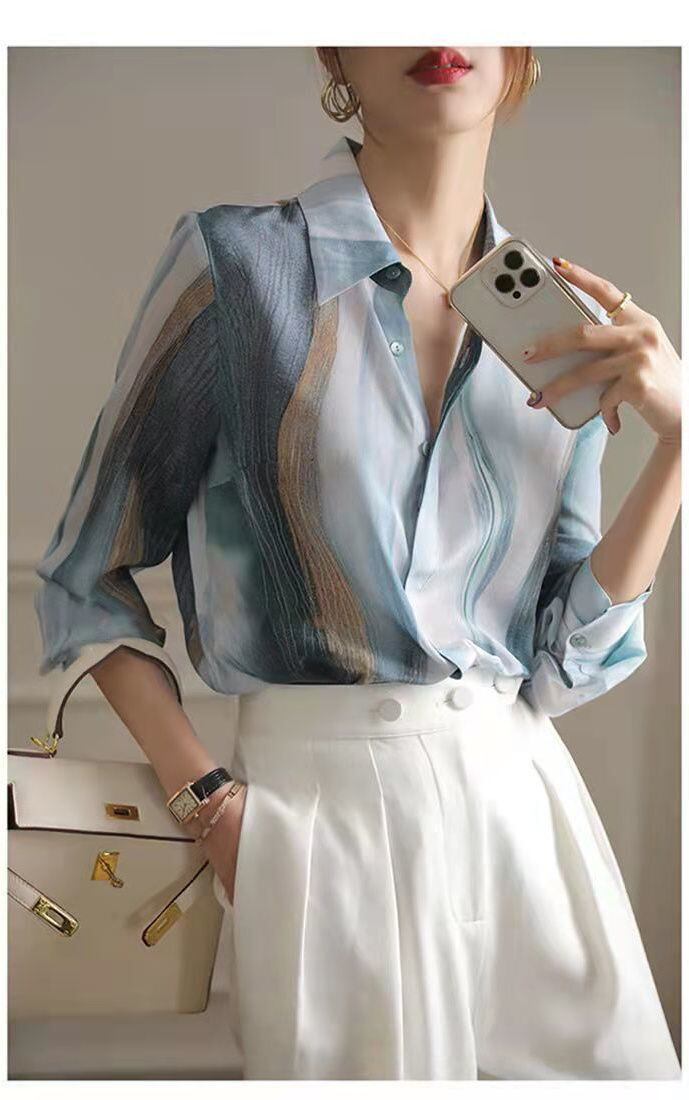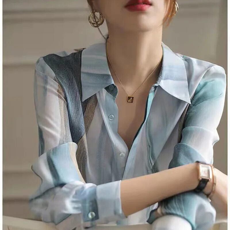 送料無料 ラペルプリントスプライスボタンルーズシフォンシャツ夏と秋トップス通勤女性ブラウス 2022 サマー 夏物 オータム 秋物 AE1288776676698785323