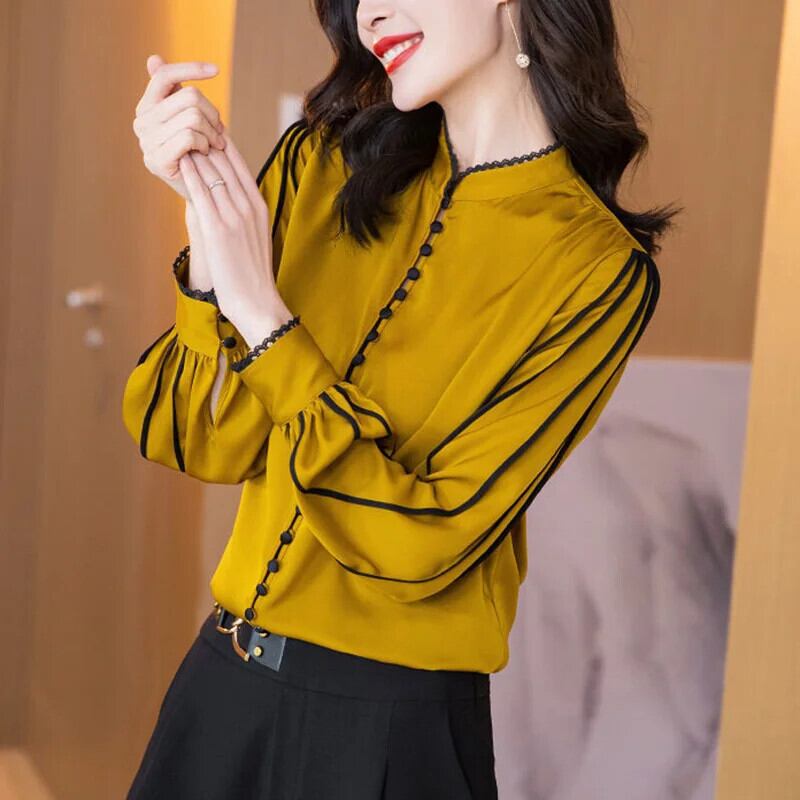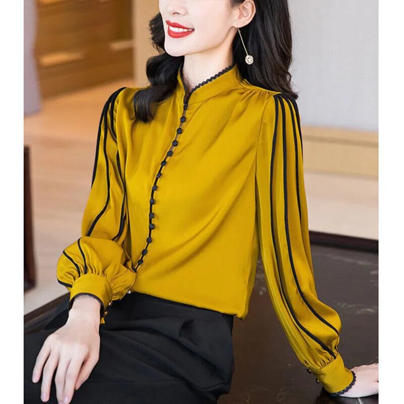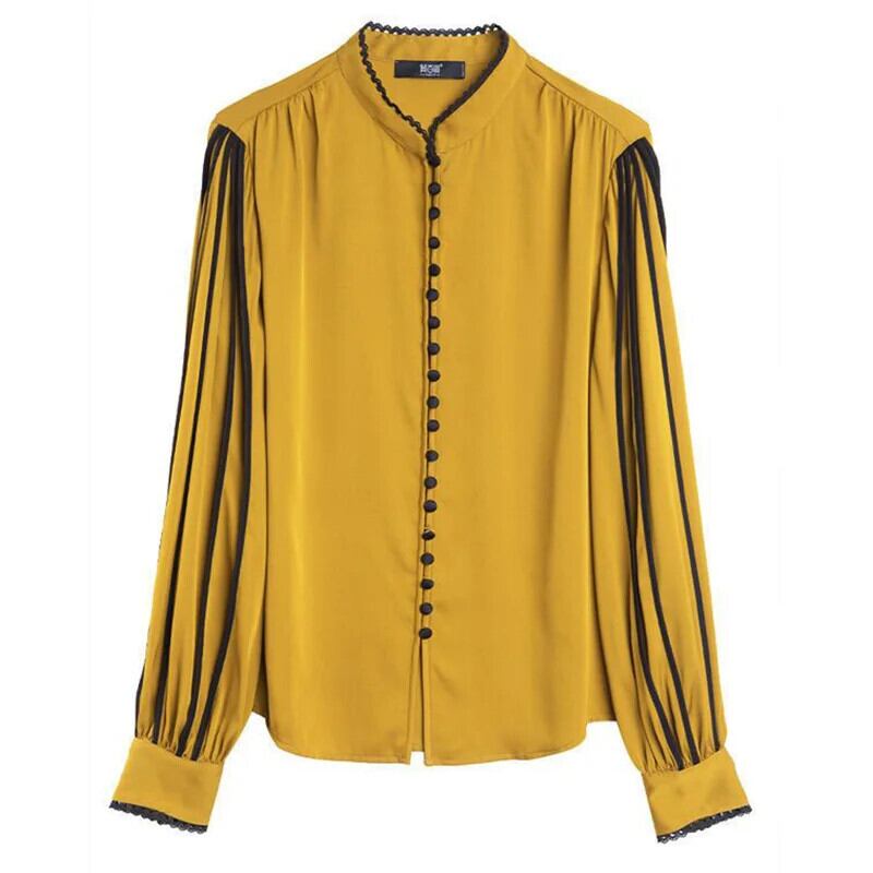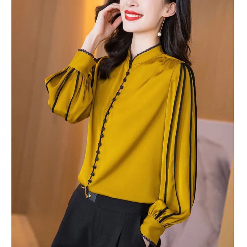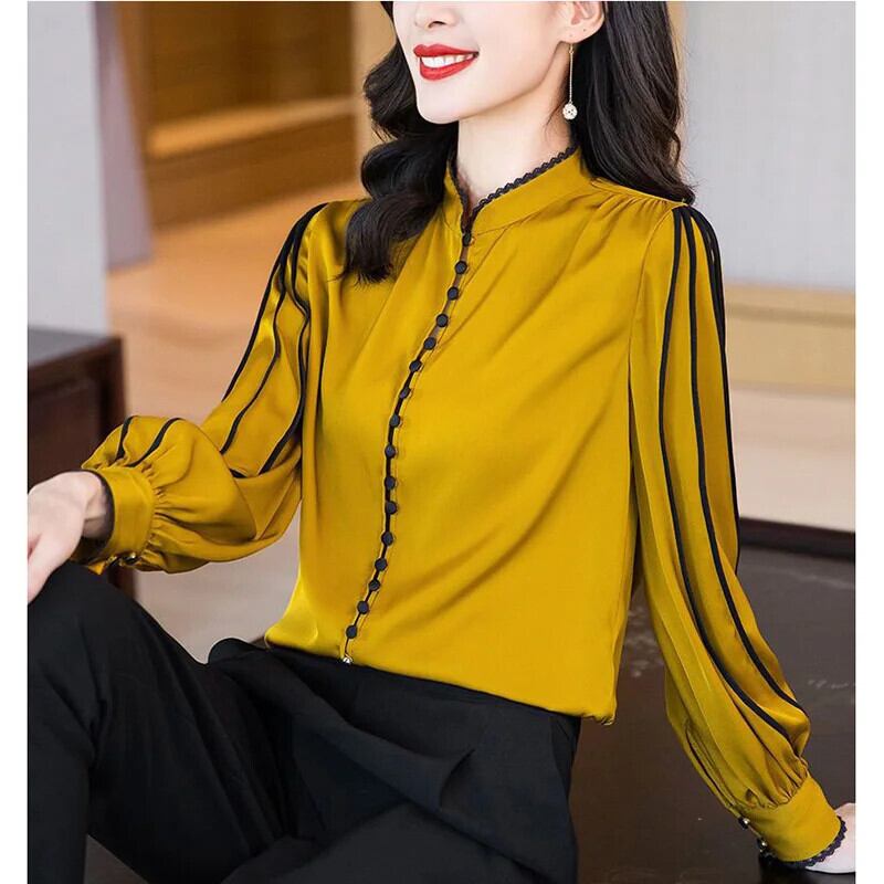送料無料 スタンドカラーボタンスプライシングひだフリルブラウス女性 2023 秋プルオーバールーズオフィスレディシャツ ラッフル オータム 秋物 会社 学校 通勤や通学にも AE1288776626710410987
