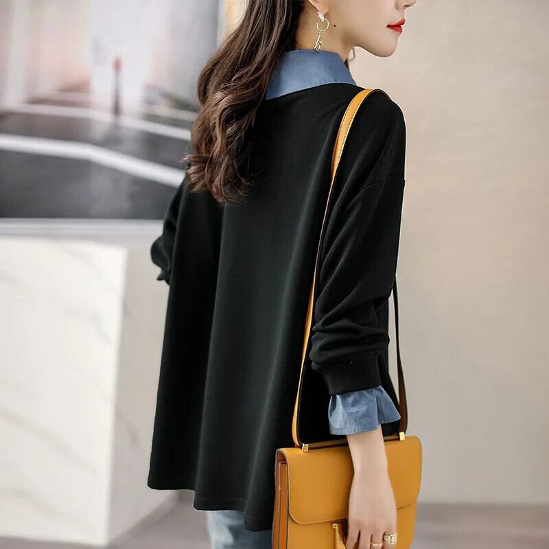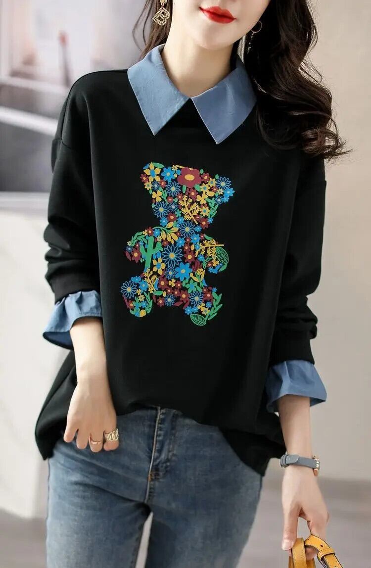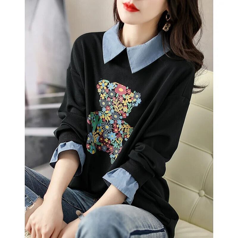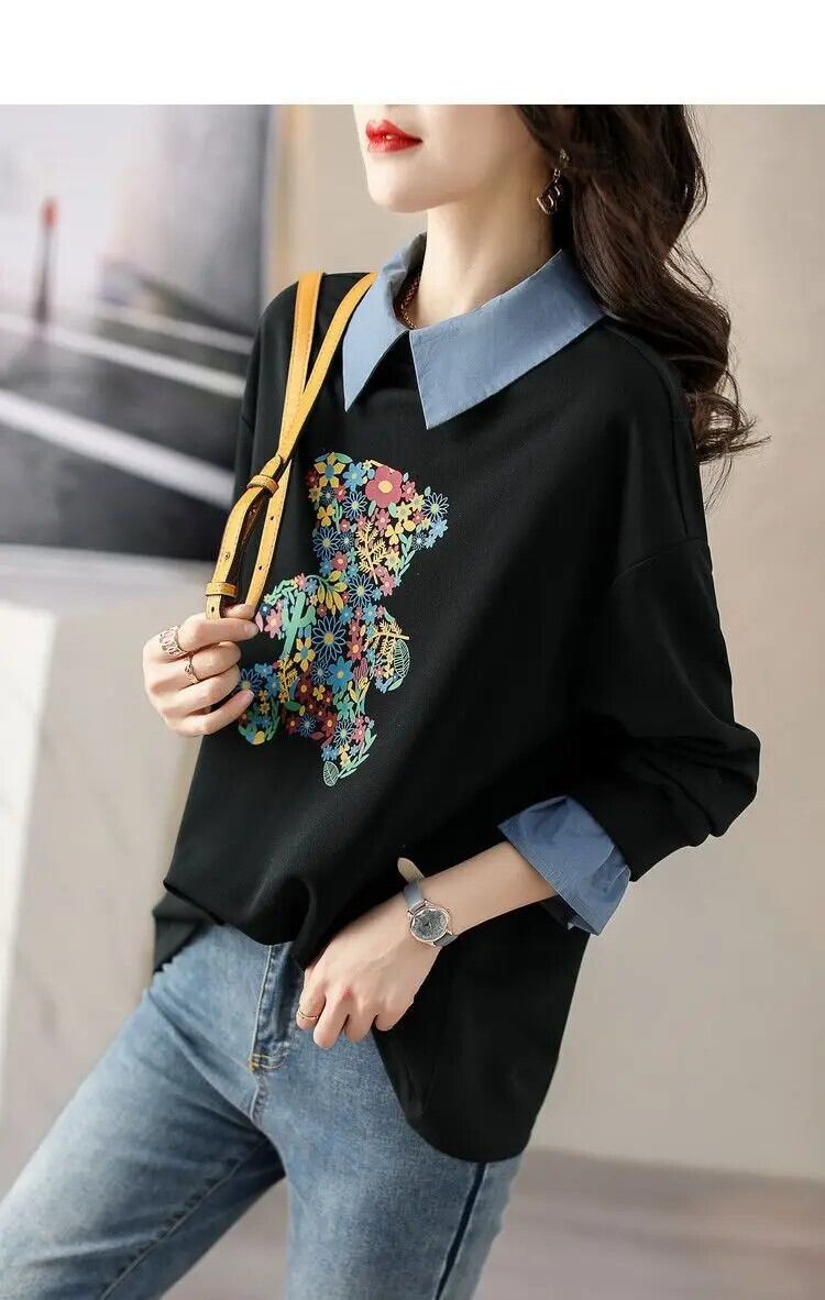 送料無料 プリント漫画スプライシング偽ツーピースブラウス 2023 秋冬ルーズトップスシャツ オータム 秋物 ウィンター 冬物 AE1288776629551338766