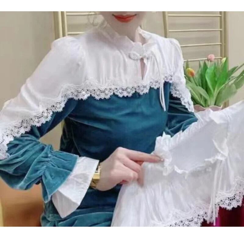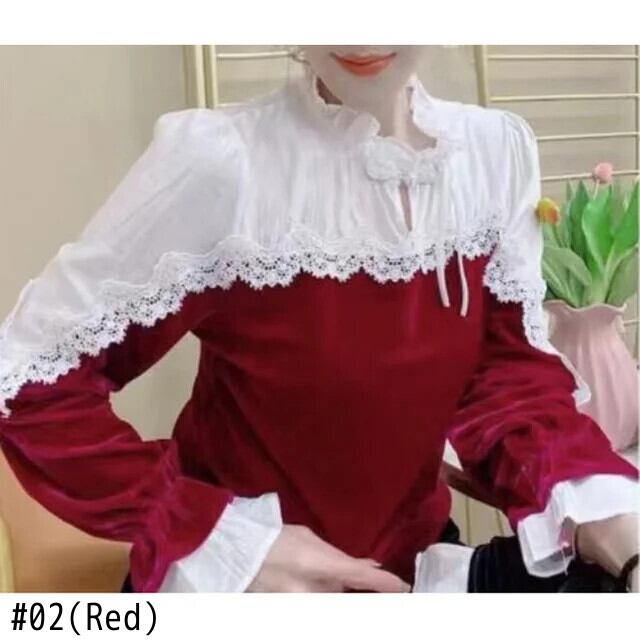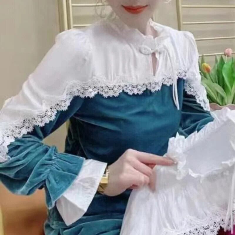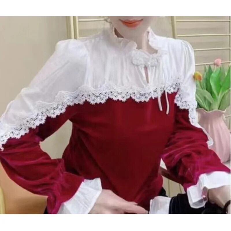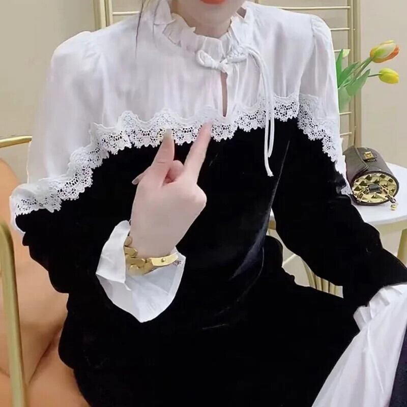送料無料 スタンドカラースプライシングフリルレースブラウス女性 2023 秋プルオーバーオールマッチオフィスレディシャツ ラッフル オータム 秋物 会社 学校 通勤や通学にも AE1288776620578874419