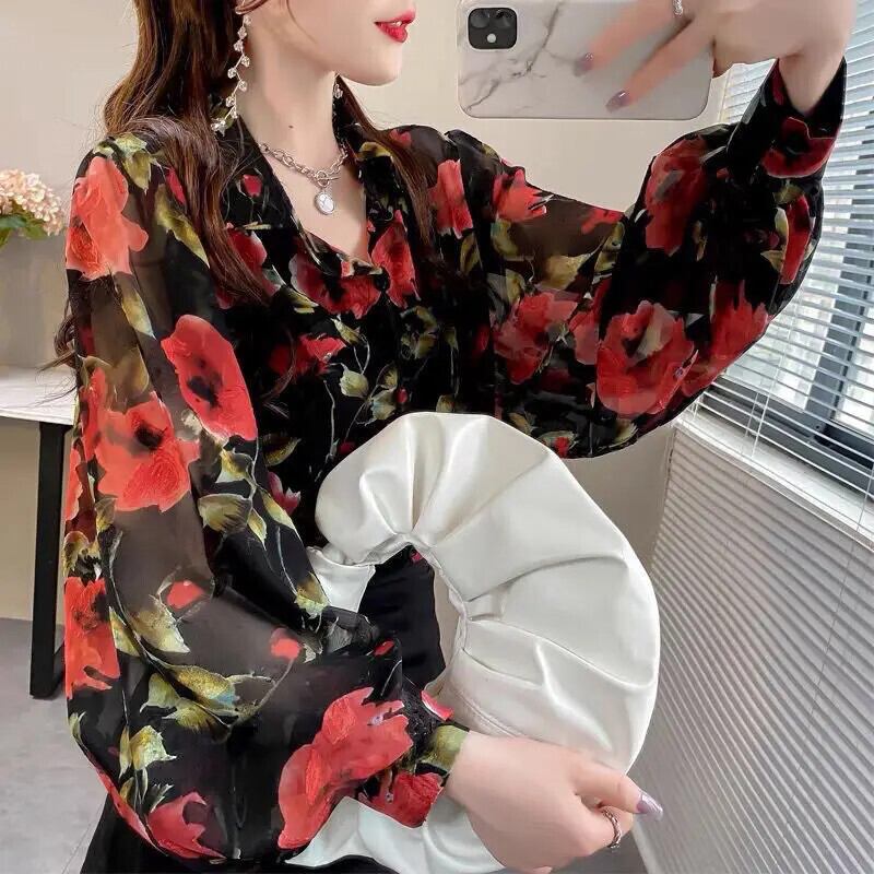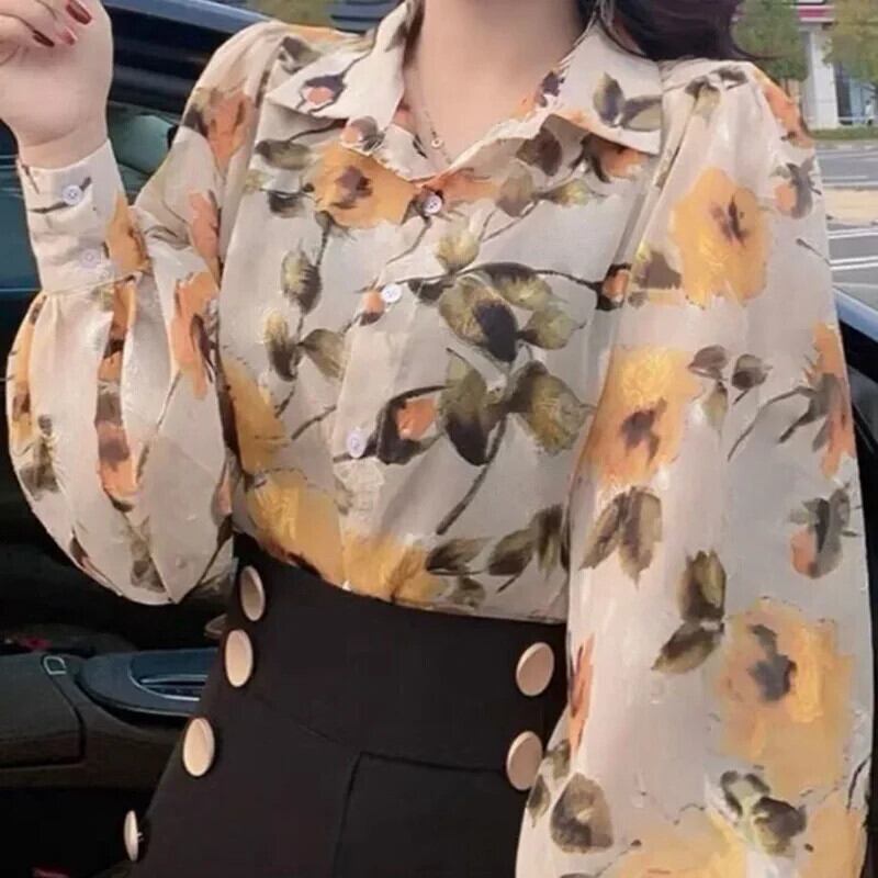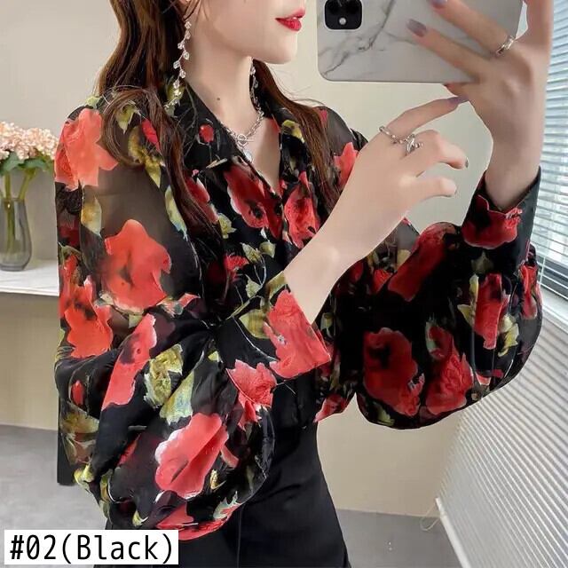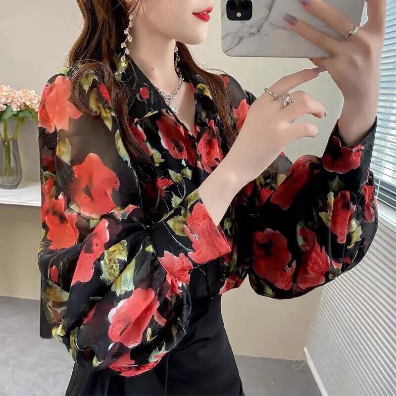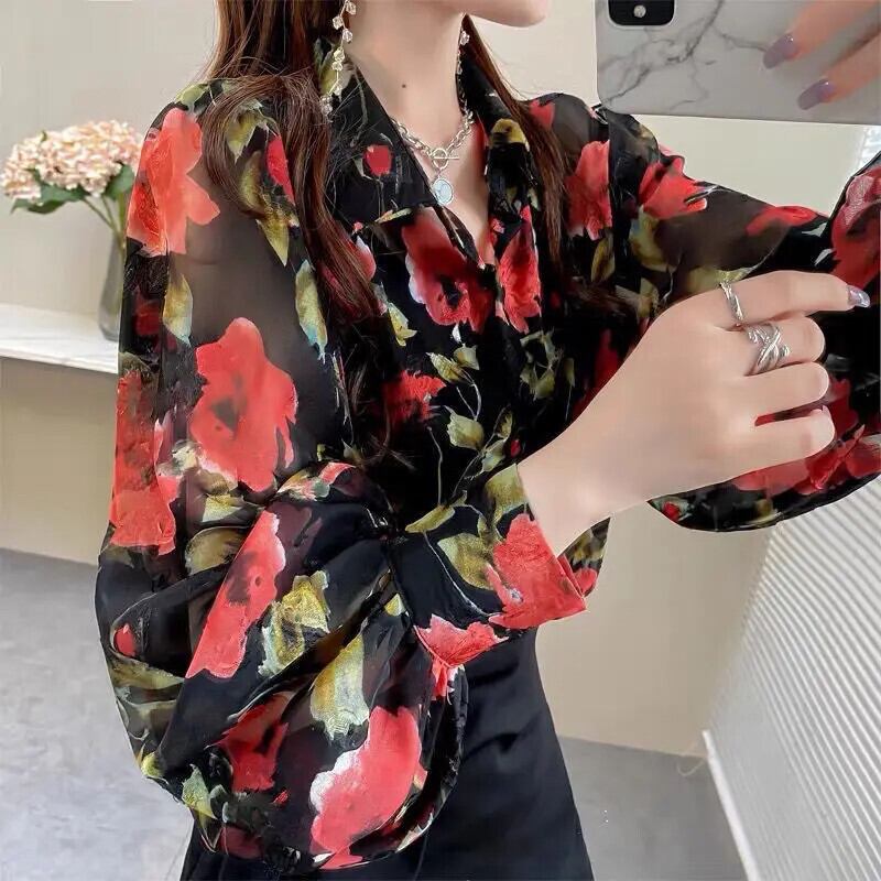 送料無料 プリントラペルランタンスリーブボタンルーズシフォンブラウス特大トップス長袖通勤女性シャツ ロング AE1288776610518991632