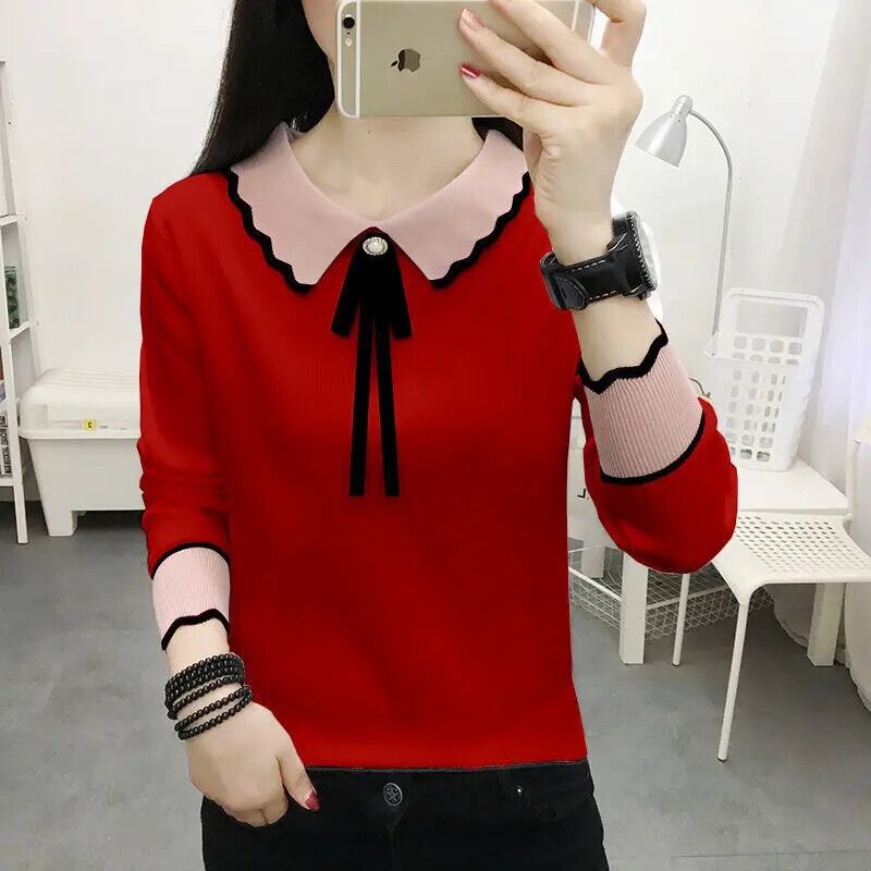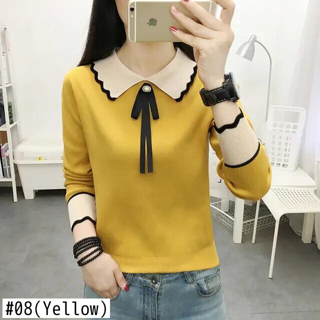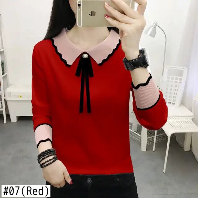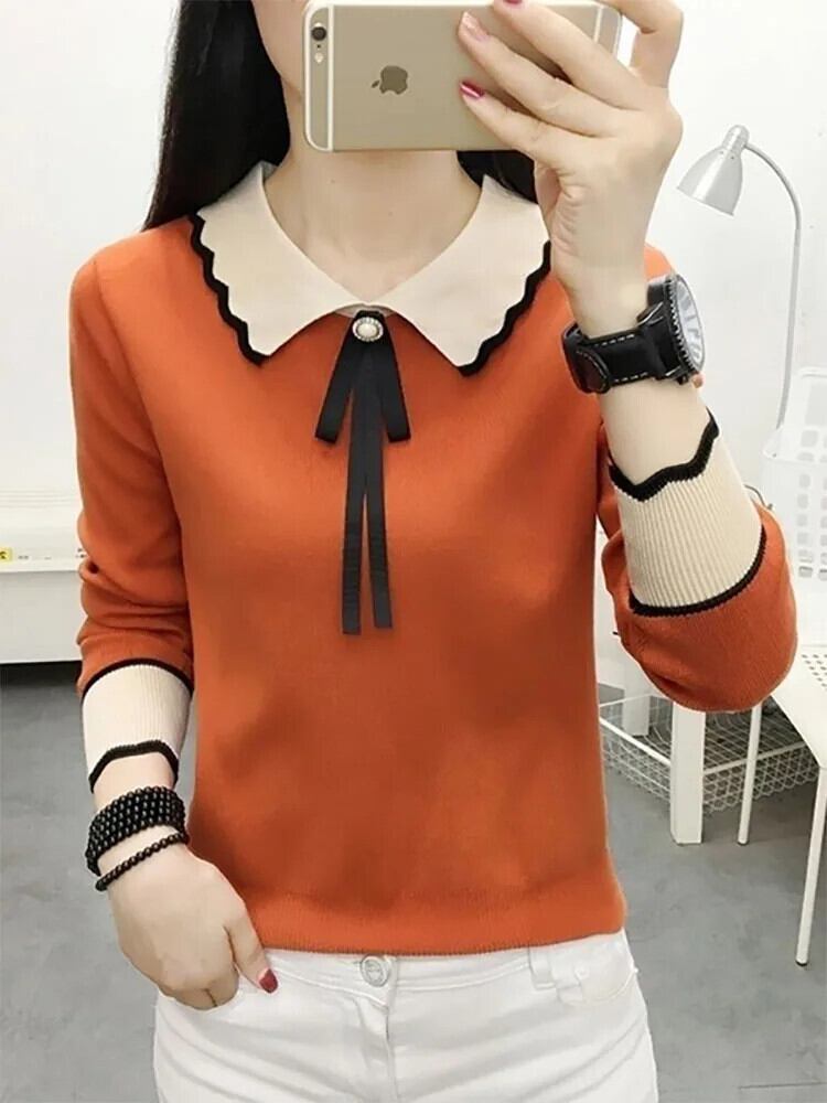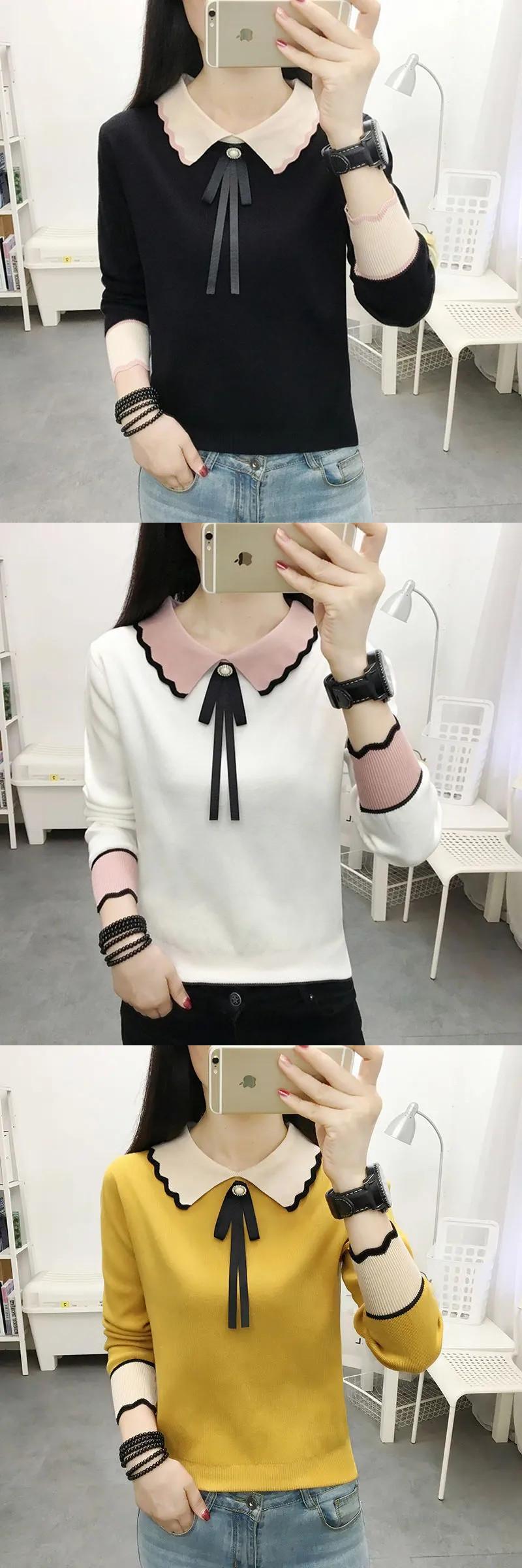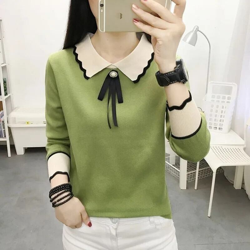 送料無料 ピーターパン襟スプライシングビーズリボンセーター女性の 2023 秋冬ルーズプルオーバー通勤トップス オータム 秋物 ウィンター 冬物 AE1288776655768293099