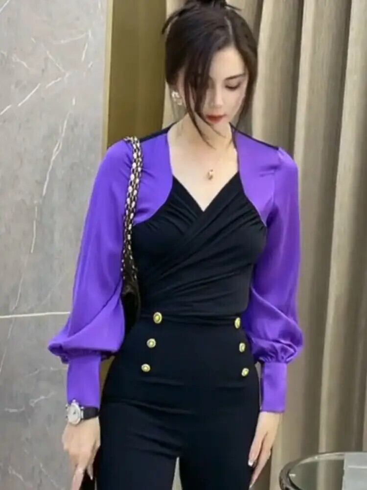 送料無料 V ネックスプライシングひだ包帯ブラウス女性の 2023 秋冬スリムオフィスレディトップスランタンスリーブシャツ オータム 秋物 ウィンター 冬物 Vネック 会社 学校 通勤や通学にも AE1288776641676748269