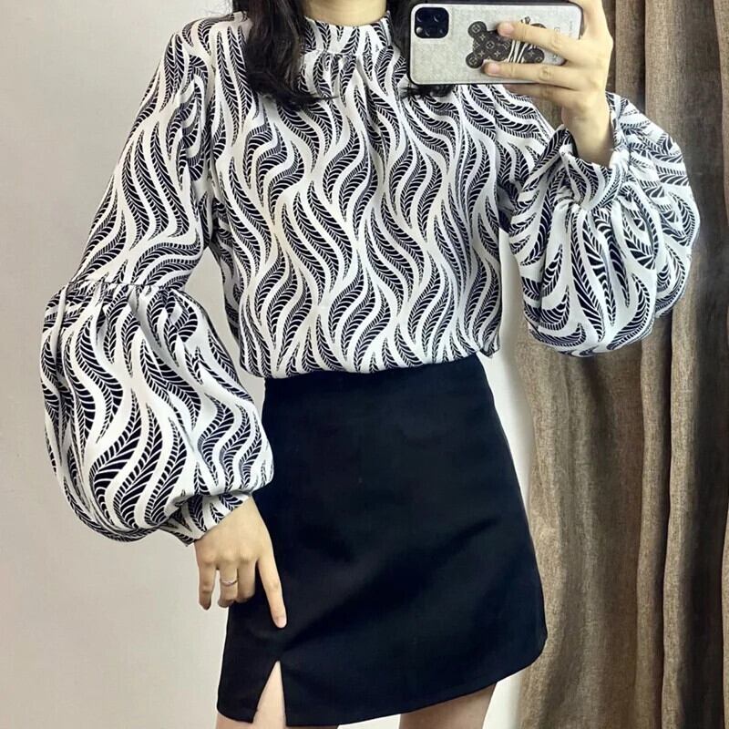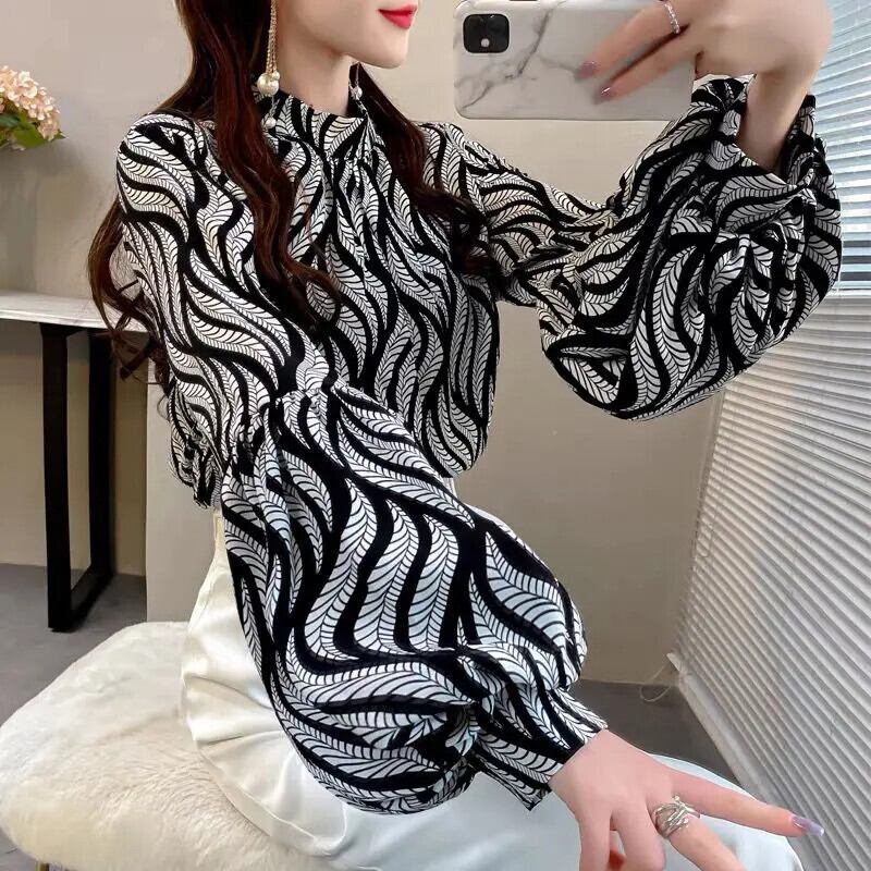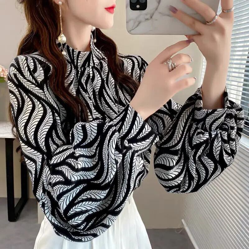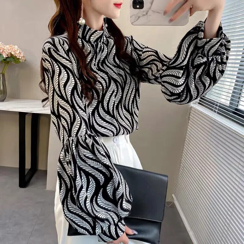 送料無料 ヴィンテージプリントシフォンストライプランタンスリーブブラウス女性 2022 オールマッチトップス秋のオフィスレディシャツ オータム 秋物 ビンテージ 会社 学校 通勤や通学にも AE1288776641968159543