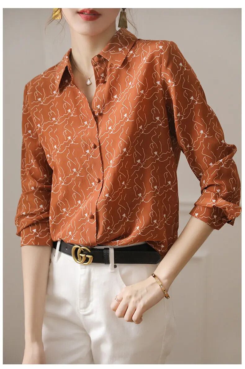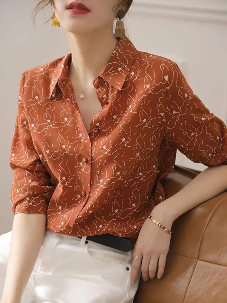 送料無料 ヴィンテージプリントラペルボタンルーズオールマッチシャツ女性の 2022 秋トップス長袖オフィスレディブラウス ロング オータム 秋物 ビンテージ 会社 学校 通勤や通学にも AE1288776696891360453