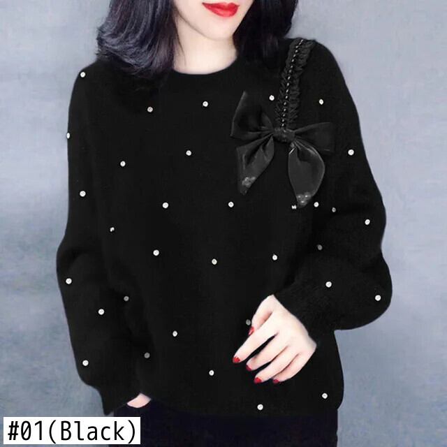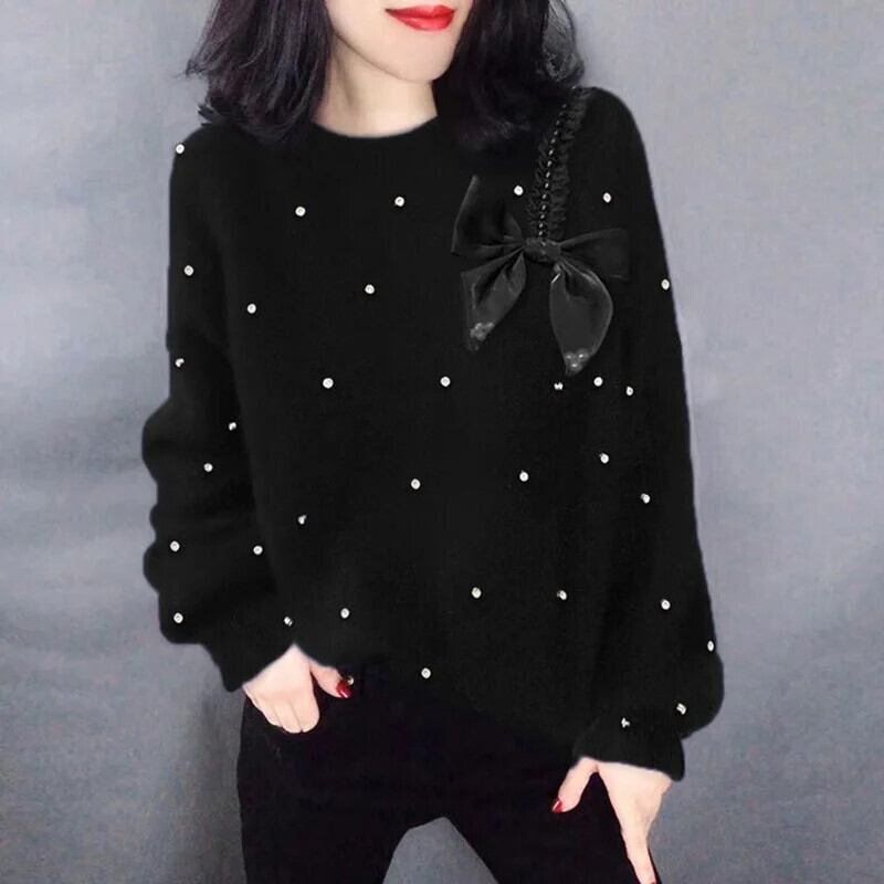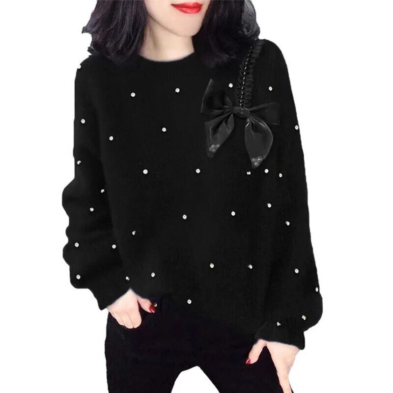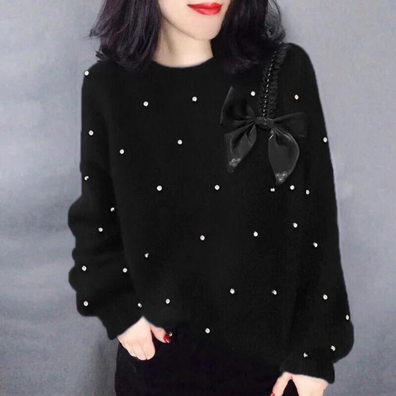 送料無料 ソリッドカラーニットスプライスビーズボウセーター2023秋プルオーバーオールマッチ通勤トップス リボン オータム 秋物 AE1288776632306413570