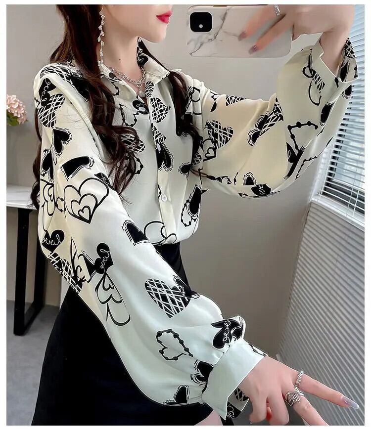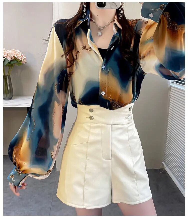 送料無料 ランタンスリーブプリントラペルボタンシフォンシャツ 2022 春特大ルーズ女性通勤ブラウス スプリング 春物 AE1288776614603489406