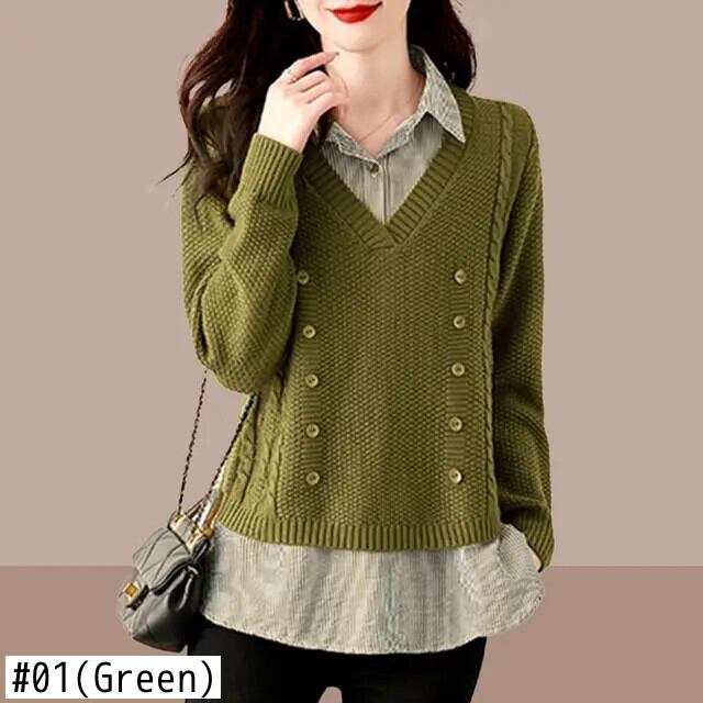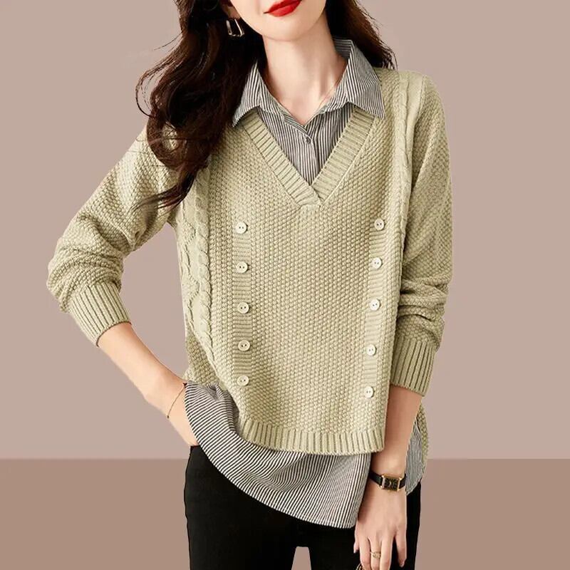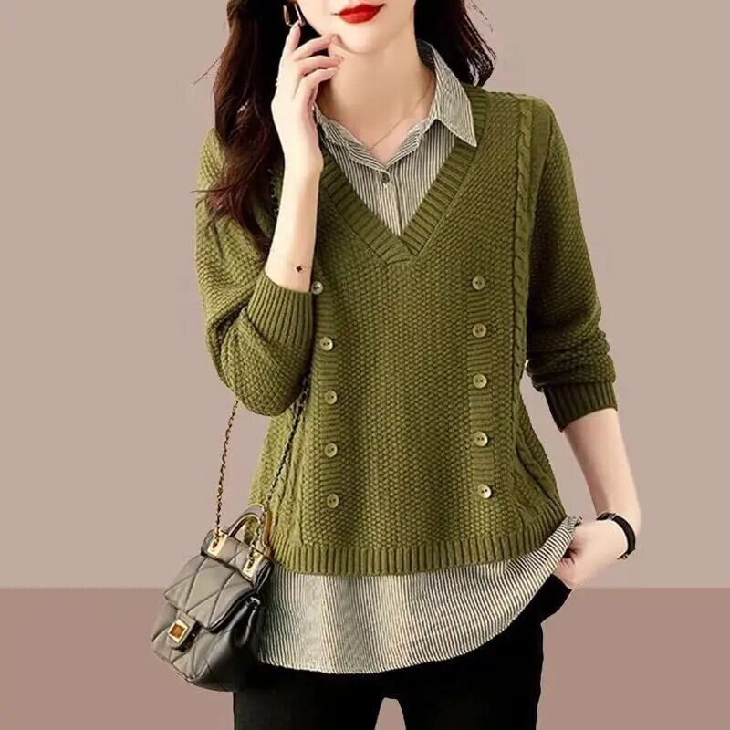 送料無料 スプライスボタンフェイクツーピースストライプブラウス女性の 2023 秋冬ニットトップス通勤シャツ オータム 秋物 ウィンター 冬物 AE1288776678902022216