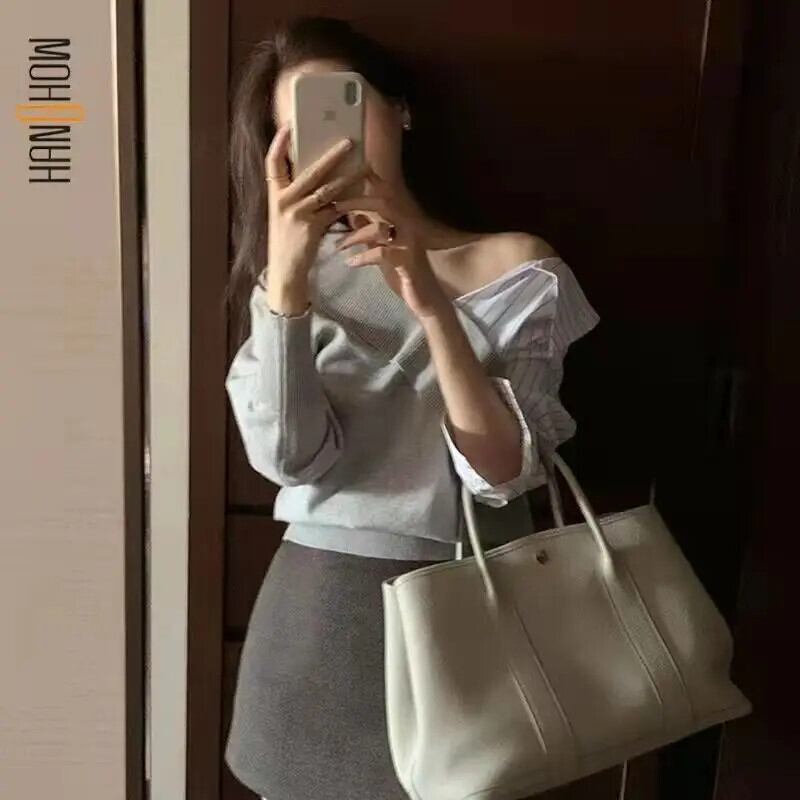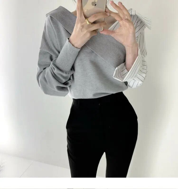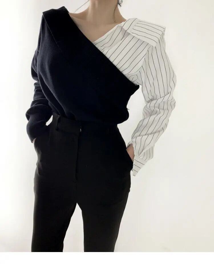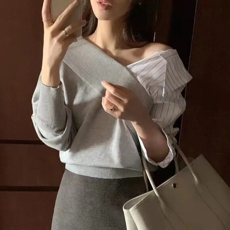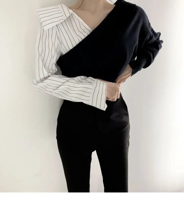送料無料 ストライプスプライシング非対称ブラウス女性の 2023 秋冬ルーズプルオーバーフェイクツーピースシャツ オータム 秋物 ウィンター 冬物 AE1288776659864361194