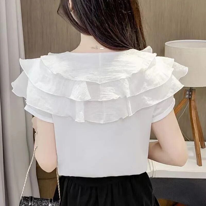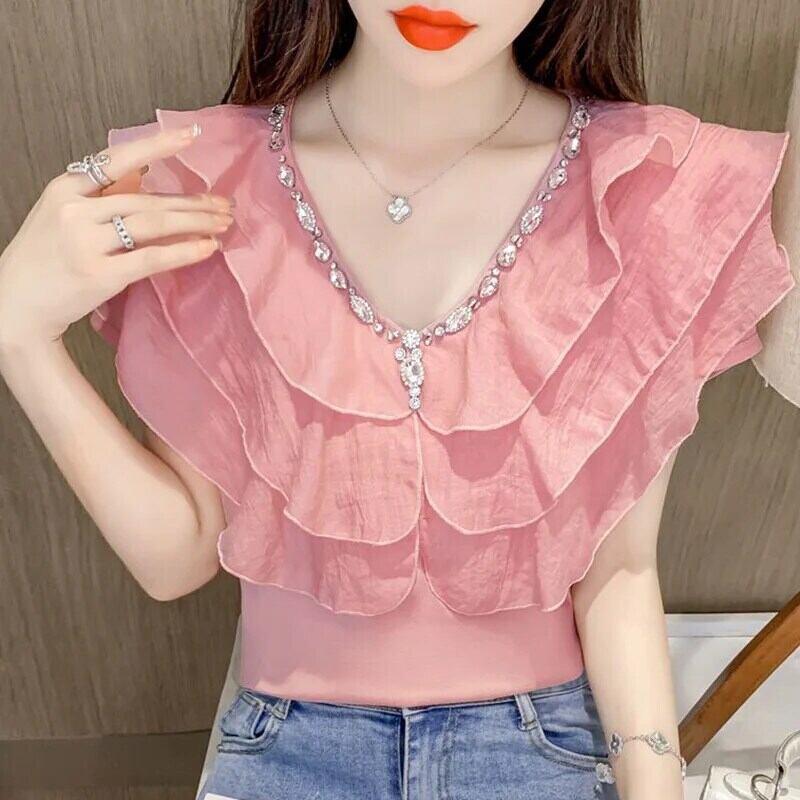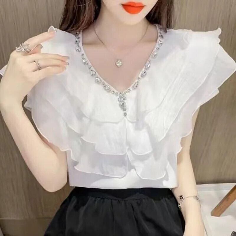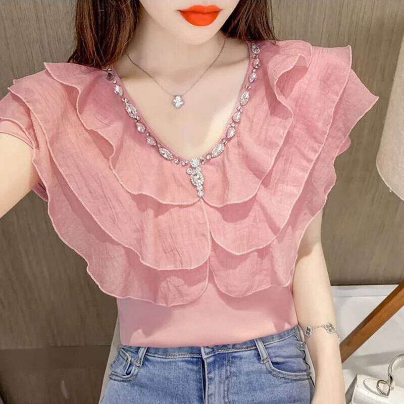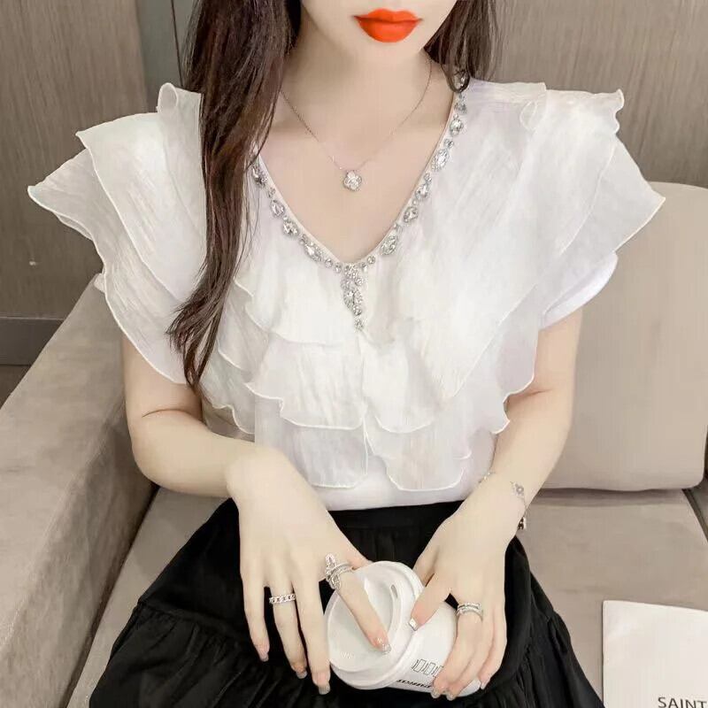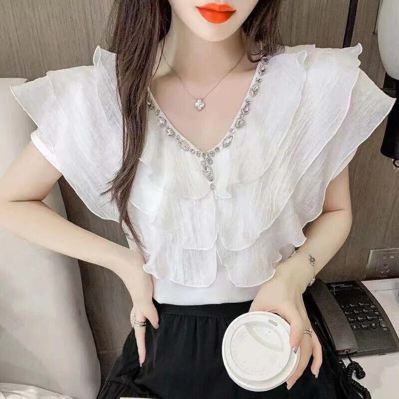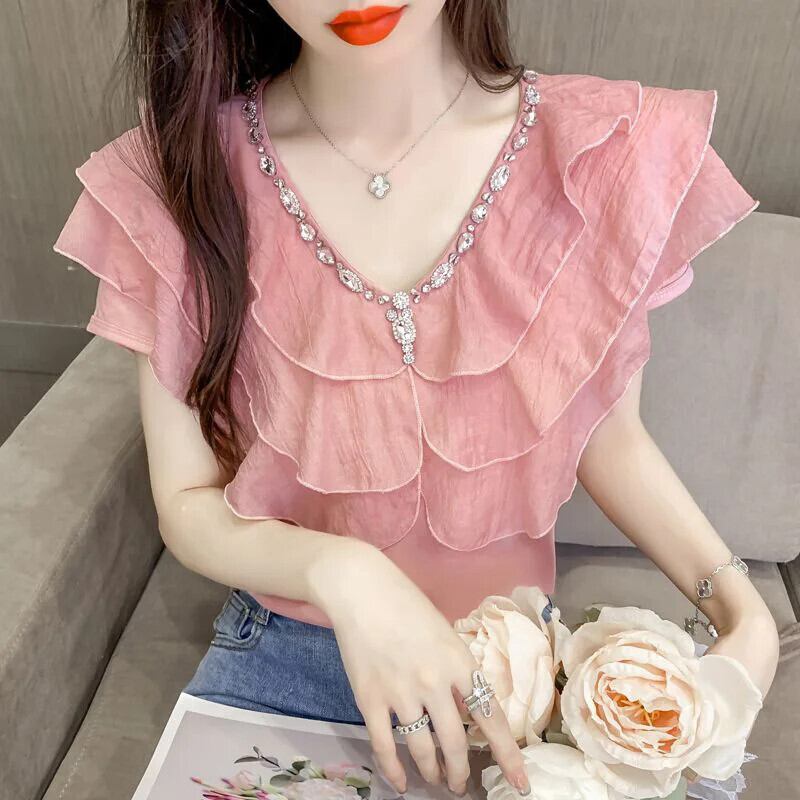 送料無料 甘い V ネックスプライシングルーズフリルダイヤモンドブラウス 2023 夏プルオーバーオフィスレディシフォンシャツ ラッフル 大人ガーリー スウィート キュート カジュアル サマー 夏物 Vネック 会社 学校 通勤や通学にも AE1288776641156976664