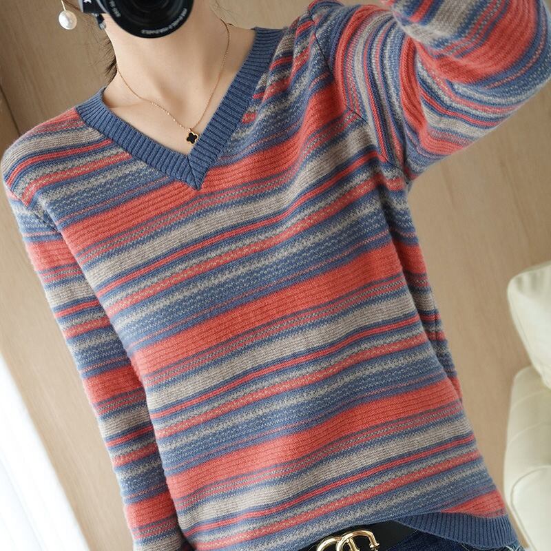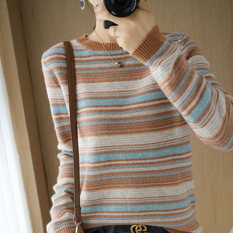 送料無料 O ネックニットスプライシングルーズストライプセーター女性の 2023 秋特大プルオーバー通勤トップス オータム 秋物 Oネック AE1288776693372975996
