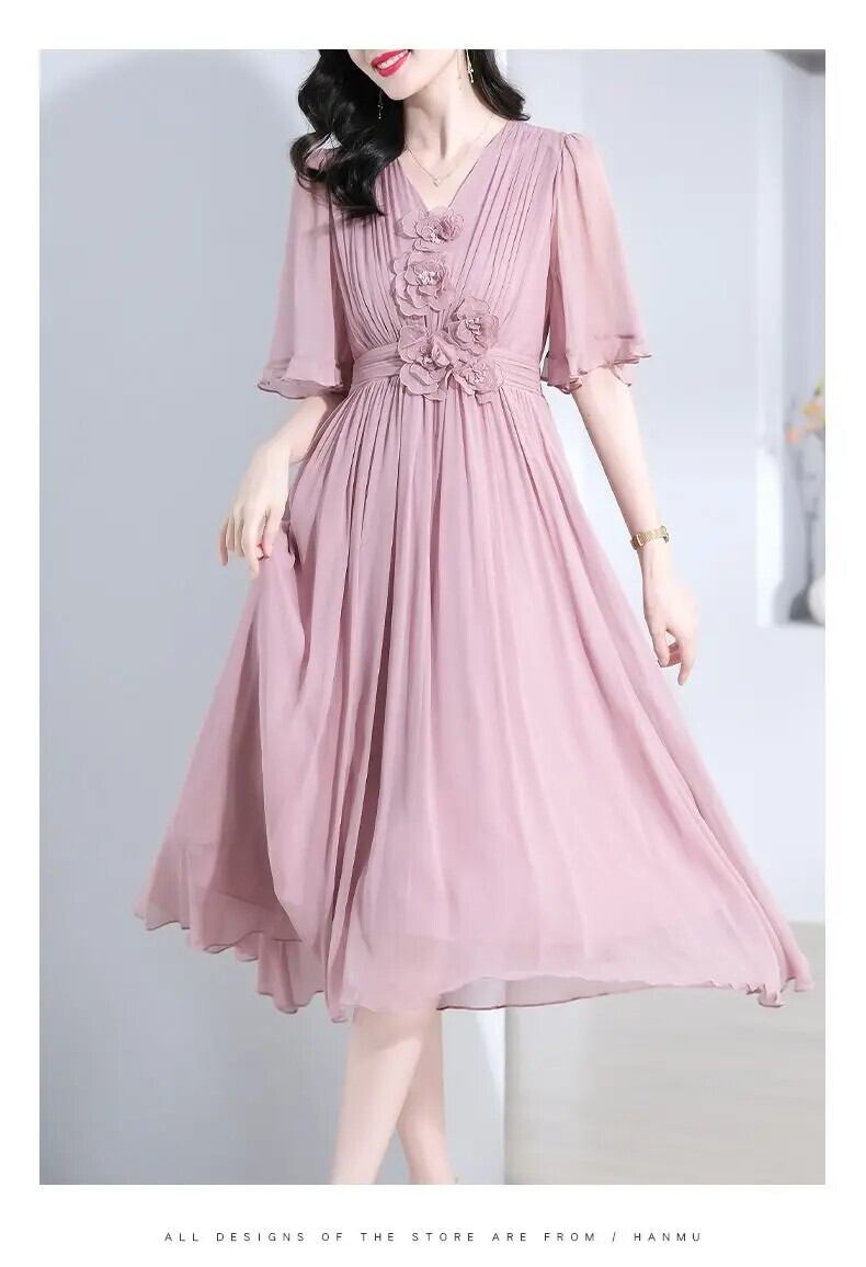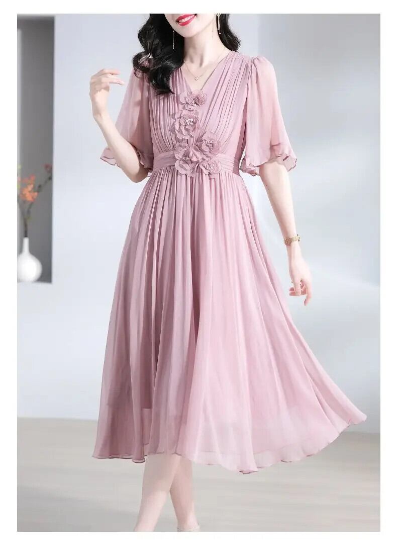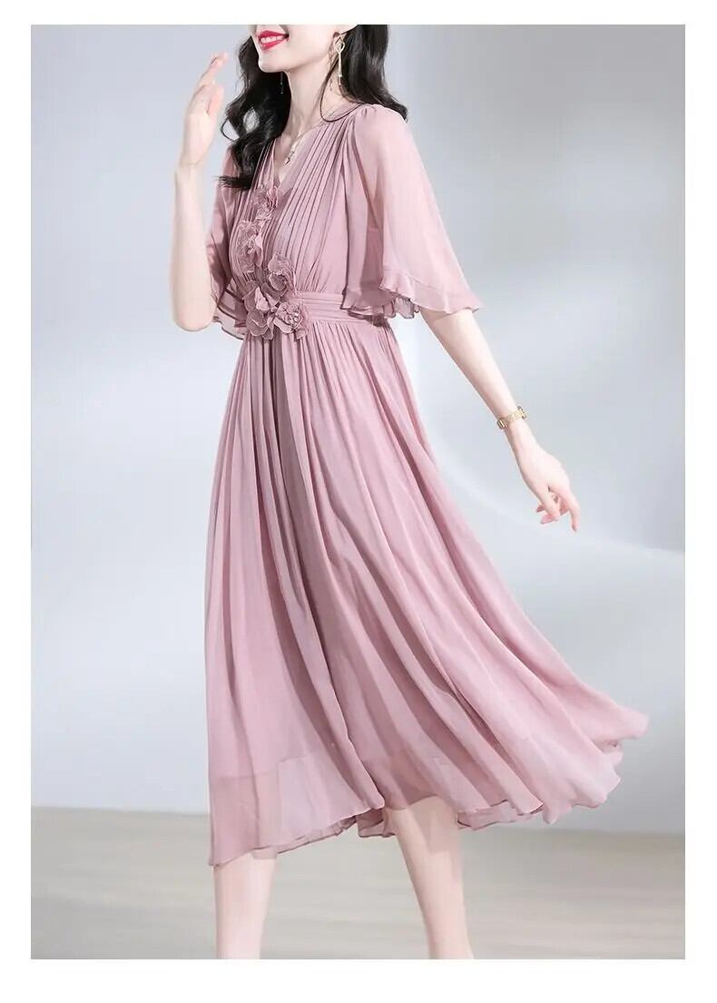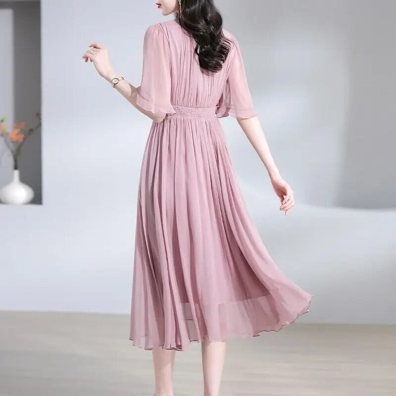 送料無料 V ネックスプライシングひだバタフライスリーブシフォンパーティードレスの女性 2024 夏ルーズオフィスレディ Dres サマー 夏物 Vネック 会社 学校 通勤や通学にも AE1288776661884817553