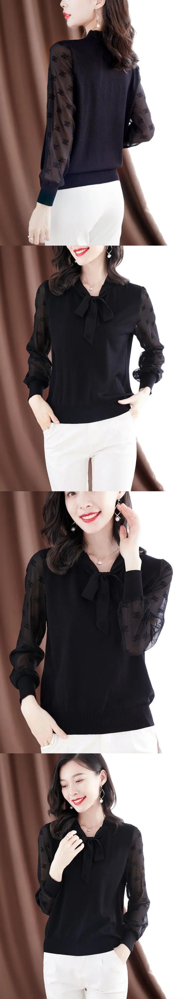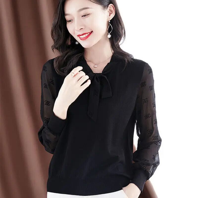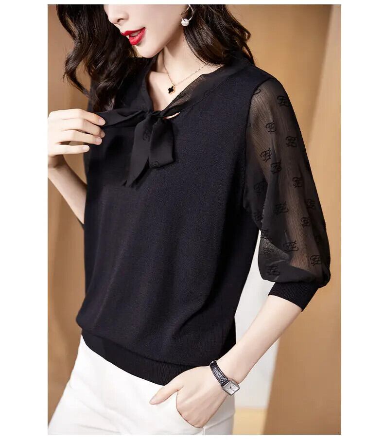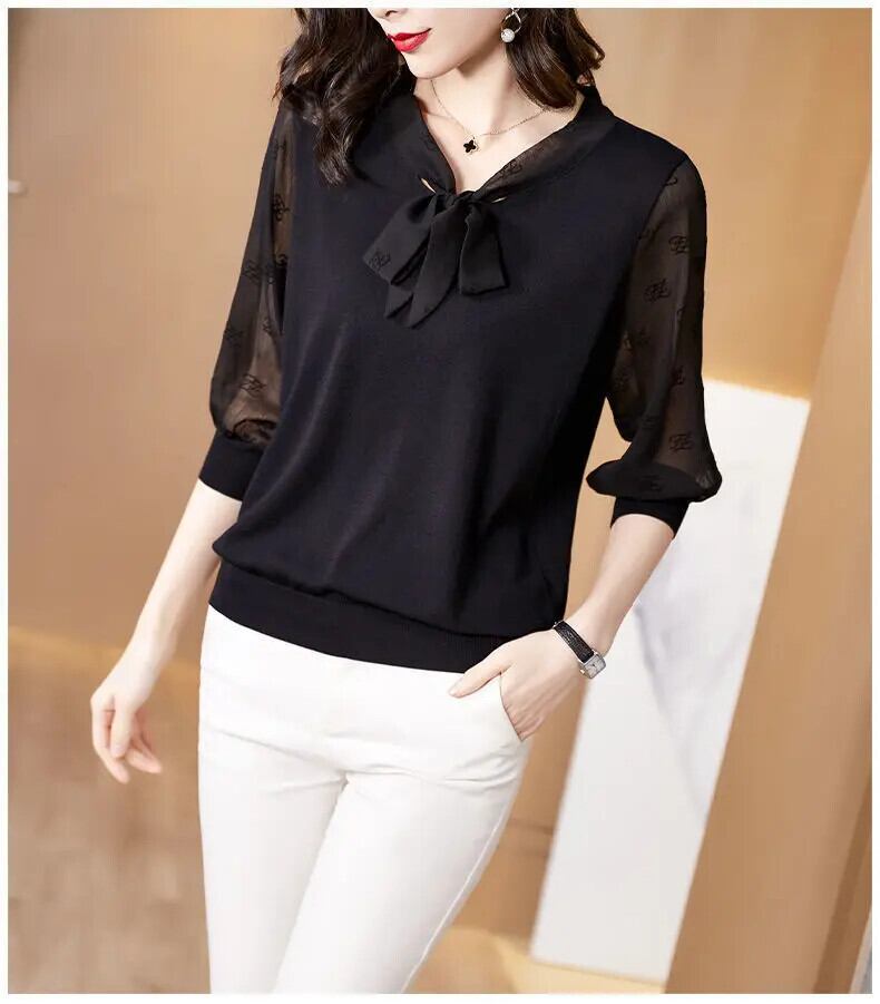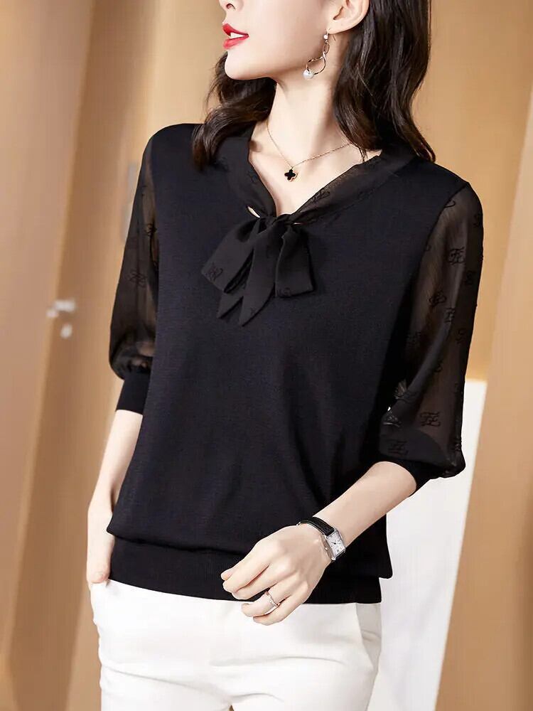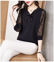 送料無料 Vネックリボンスプライシングシフォン植毛特大シャツ春と夏のトップスルーズ通勤レディースブラウス スプリング 春物 サマー 夏物 AE1288776638228178248